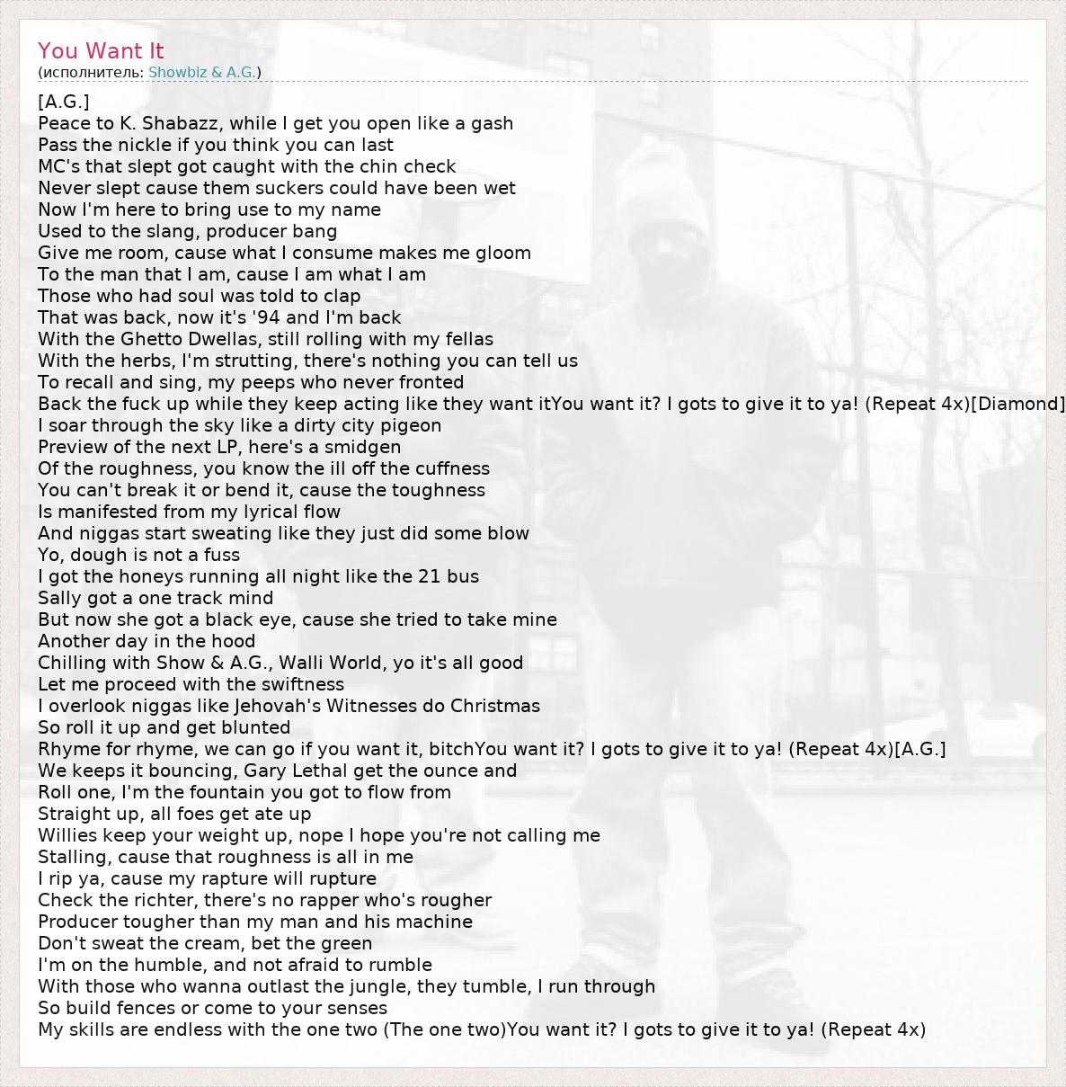 Rhyme for rhyme, we can go if you want it, bitchYou want it? I gots to give it to ya! (Repeat 4x)[A.G.]