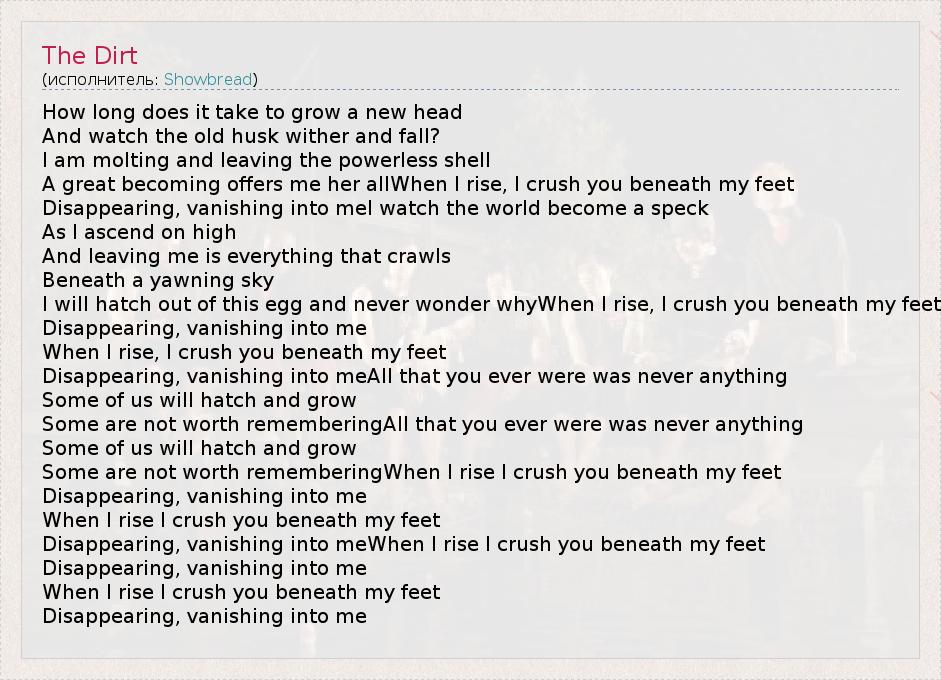 Это интересно:Showbread образовались в одной из церквей Саванны (штат Джордия) в 1998-м как группа церковного прославления, играющая по воскресениям. С детства парни росли на музыке Майкла Дабви Смита, Стива Кертиса Чапмена и Carman’а.Название Showbread символизирует “хлеб”, являющийся плотью Христа и тот хлеб, который евреи хранили в храмах, а также хлеб, который Бог разрешил есть Давиду в субботний день (см.... продолжение
