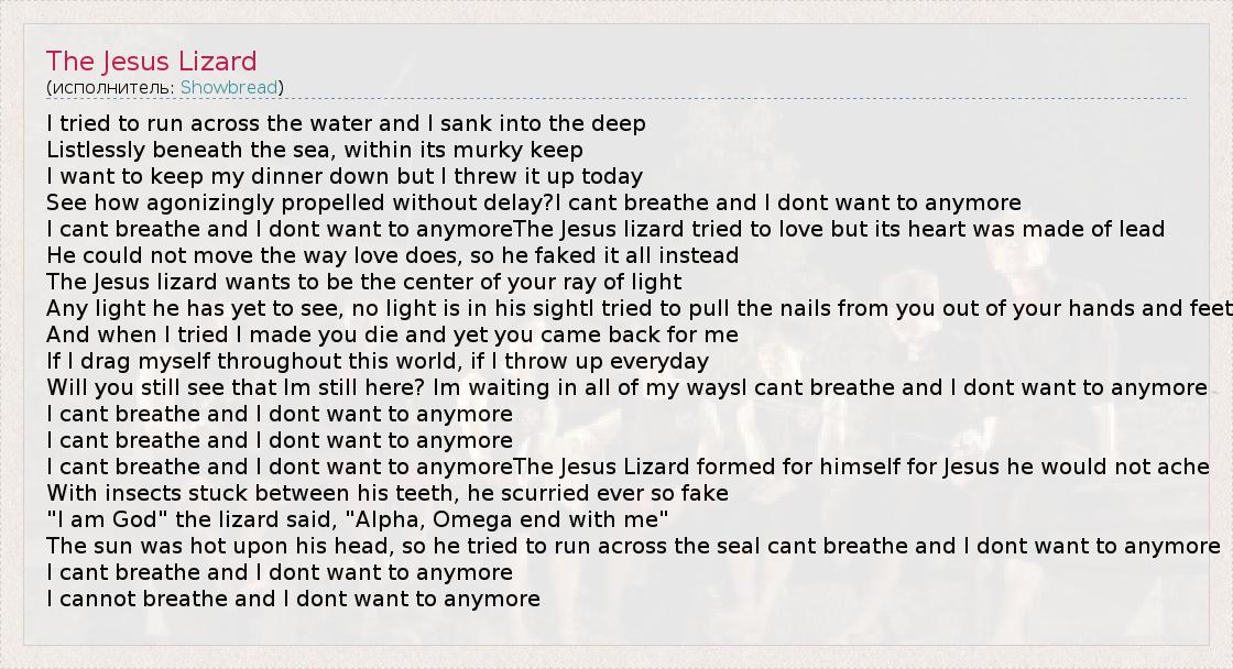 I tried to run across the water and I sank into the deep Listlessly beneath the sea, within its murky keep I want to keep my dinner down but I threw it up today See how agonizingly propelled without delay?I cant breathe and I dont want to anymore I cant breathe and I dont want to anymoreThe Jesus lizard tried to love but its heart was made of lead He could not move the way love does, so he faked it all instead The Jesus lizard wants to be the center of your ray of light Any light he has yet to see, no light is in his sightI tried to pull the nails from you out of your hands and feet And when I tried I made you die and yet you came back for me If I drag myself throughout this world, if I throw up everyday Will you still see that Im still here? Im waiting in all of my waysI cant breathe and I dont want to anymore I cant breathe and I dont want to anymore I cant breathe and I dont want to anymore I cant breathe and I dont want to anymoreThe Jesus Lizard formed for himself for Jesus he would not ache With insects stuck between his teeth, he scurried ever so fake "I am God" the lizard said, "Alpha, Omega end with me" The sun was hot upon his head, so he tried to run across the seaI cant breathe and I dont want to anymore I cant breathe and I dont want to anymore I cannot breathe and I dont want to anymore