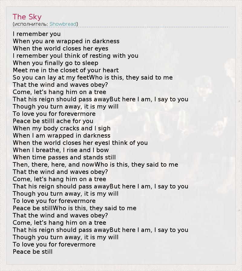 I remember you When you are wrapped in darkness When the world closes her eyes I remember youI think of resting with you When you finally go to sleep Meet me in the closet of your heart So you can lay at my feetWho is this, they said to me That the wind and waves obey? Come, let's hang him on a tree That his reign should pass awayBut here I am, I say to you Though you turn away, it is my will To love you for forevermore Peace be stillI ache for you When my body cracks and I sigh When I am wrapped in darkness When the world closes her eyesI think of you When I breathe, I rise and I bow When time passes and stands still Then, there, here, and nowWho is this, they said to me That the wind and waves obey? Come, let's hang him on a tree That his reign should pass awayBut here I am, I say to you Though you turn away, it is my will To love you for forevermore Peace be stillWho is this, they said to me That the wind and waves obey? Come, let's hang him on a tree That his reign should pass awayBut here I am, I say to you Though you turn away, it is my will To love you for forevermore Peace be still