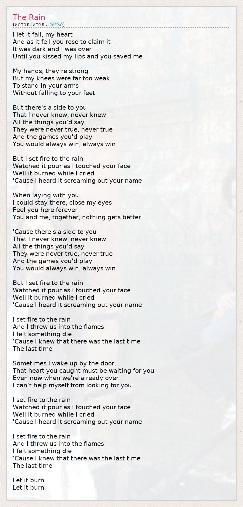 I let it fall, my heart And as it fell you rose to claim it It was dark and I was over Until you kissed mу lips and you saved me My hands, they're strong But my knees were far too weak To stand in your arms Without falling to your feet But there's a side to you That I never knew, never knew All the things you'd say They were never true, never true And the games you'd play You would always win, always win But I set fire to the rain Watched it pour as I touched your face Well it burned while I cried 'Cause I heard it screaming out your name When laying with you I could stay there, close my eyes Feel you here forever You and me, together, nothing gets better 'Cause there's a side to you That I never knew, never knew All the things you'd say They were never true, never true And the games you'd play You would always win, always win But I set fire to the rain Watched it pour as I touched your face Well it burned while I cried 'Cause I heard it screaming out your name I set fire to the rain And I threw us into the flames I felt something die 'Cause I knew that there was the last time The last time Sometimes I wake up by the door, That heart you caught must be waiting for you Even now when we're already over I can't help myself from looking for you I set fire to the rain Watched it pour as I touched your face Well it burned while I cried 'Cause I heard it screaming out your name I set fire to the rain And I threw us into the flames I felt something die 'Cause I knew that there was the last time The last time Let it burn Let it burn