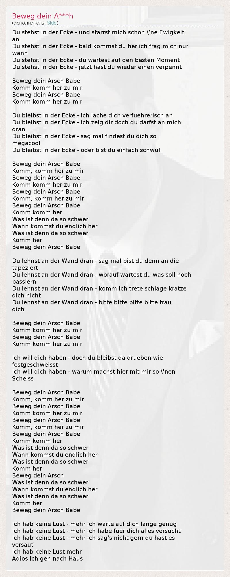 Du stehst in der Ecke - und starrst mich schon \'ne Ewigkeit an Du stehst in der Ecke - bald kommst du her ich frag mich nur wann Du stehst in der Ecke - du wartest auf den besten Moment Du stehst in der Ecke - jetzt hast du wieder einen verpennt Beweg dein Arsch Babe Komm komm her zu mir Beweg dein Arsch Babe Komm komm her zu mir Du bleibst in der Ecke - ich lache dich verfuehrerisch an Du bleibst in der Ecke - ich zeig dir doch du darfst an mich dran Du bleibst in der Ecke - sag mal findest du dich so megacool Du bleibst in der Ecke - oder bist du einfach schwul Beweg dein Arsch Babe Komm, komm her zu mir Beweg dein Arsch Babe Komm komm her zu mir Beweg dein Arsch Babe Komm, komm her zu mir Beweg dein Arsch Babe Komm komm her Was ist denn da so schwer Wann kommst du endlich her Was ist denn da so schwer Komm her Beweg dein Arsch Babe Du lehnst an der Wand dran - sag mal bist du denn an die tapeziert Du lehnst an der Wand dran - worauf wartest du was soll noch passiern Du lehnst an der Wand dran - komm ich trete schlage kratze dich nicht Du lehnst an der Wand dran - bitte bitte bitte bitte trau dich Beweg dein Arsch Babe Komm komm her zu mir Beweg dein Arsch Babe Komm komm her zu mir Ich will dich haben - doch du bleibst da drueben wie festgeschweisst Ich will dich haben - warum machst hier mit mir so \'nen Scheiss Beweg dein Arsch Babe Komm, komm her zu mir Beweg dein Arsch Babe Komm komm her zu mir Beweg dein Arsch Babe Komm, komm her zu mir Beweg dein Arsch Babe Komm komm her Was ist denn da so schwer Wann kommst du endlich her Was ist denn da so schwer Komm her Beweg dein Arsch Was ist denn da so schwer Wann kommst du endlich her Was ist denn da so schwer Komm her Beweg dein Arsch Babe Ich hab keine Lust - mehr ich warte auf dich lange genug Ich hab keine Lust - mehr ich habe fuer dich alles versucht Ich hab keine Lust - mehr ich sag’s nicht gern du hast es versaut Ich hab keine Lust mehr Adios ich geh nach Haus