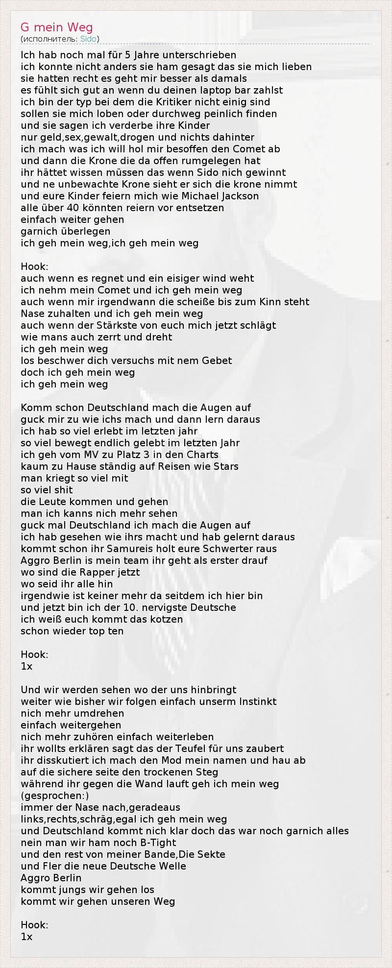 Ich hab noch mal für 5 Jahre unterschrieben ich konnte nicht anders sie ham gesagt das sie mich lieben sie hatten recht es geht mir besser als damals es fühlt sich gut an wenn du deinen laptop bar zahlst ich bin der typ bei dem die Kritiker nicht einig sind sollen sie mich loben oder durchweg peinlich finden und sie sagen ich verderbe ihre Kinder nur geld,sex,gewalt,drogen und nichts dahinter ich mach was ich will hol mir besoffen den Comet ab und dann die Krone die da offen rumgelegen hat ihr hättet wissen müssen das wenn Sido nich gewinnt und ne unbewachte Krone sieht er sich die krone nimmt und eure Kinder feiern mich wie Michael Jackson alle über 40 könnten reiern vor entsetzen einfach weiter gehen garnich überlegen ich geh mein weg,ich geh mein weg Hook: auch wenn es regnet und ein eisiger wind weht ich nehm mein Comet und ich geh mein weg auch wenn mir irgendwann die scheiße bis zum Kinn steht Nase zuhalten und ich geh mein weg auch wenn der Stärkste von euch mich jetzt schlägt wie mans auch zerrt und dreht ich geh mein weg los beschwer dich versuchs mit nem Gebet doch ich geh mein weg ich geh mein weg Komm schon Deutschland mach die Augen auf guck mir zu wie ichs mach und dann lern daraus ich hab so viel erlebt im letzten jahr so viel bewegt endlich gelebt im letzten Jahr ich geh vom MV zu Platz 3 in den Charts kaum zu Hause ständig auf Reisen wie Stars man kriegt so viel mit so viel shit die Leute kommen und gehen man ich kanns nich mehr sehen guck mal Deutschland ich mach die Augen auf ich hab gesehen wie ihrs macht und hab gelernt daraus kommt schon ihr Samureis holt eure Schwerter raus Aggro Berlin is mein team ihr geht als erster drauf wo sind die Rapper jetzt wo seid ihr alle hin irgendwie ist keiner mehr da seitdem ich hier bin und jetzt bin ich der 10. nervigste Deutsche ich weiß euch kommt das kotzen schon wieder top ten Hook: 1x Und wir werden sehen wo der uns hinbringt weiter wie bisher wir folgen einfach unserm Instinkt nich mehr umdrehen einfach weitergehen nich mehr zuhören einfach weiterleben ihr wollts erklären sagt das der Teufel für uns zaubert ihr disskutiert ich mach den Mod mein namen und hau ab auf die sichere seite den trockenen Steg während ihr gegen die Wand lauft geh ich mein weg (gesprochen:) immer der Nase nach,geradeaus links,rechts,schräg,egal ich geh mein weg und Deutschland kommt nich klar doch das war noch garnich alles nein man wir ham noch B-Tight und den rest von meiner Bande,Die Sekte und Fler die neue Deutsche Welle Aggro Berlin kommt jungs wir gehen los kommt wir gehen unseren Weg Hook: 1x