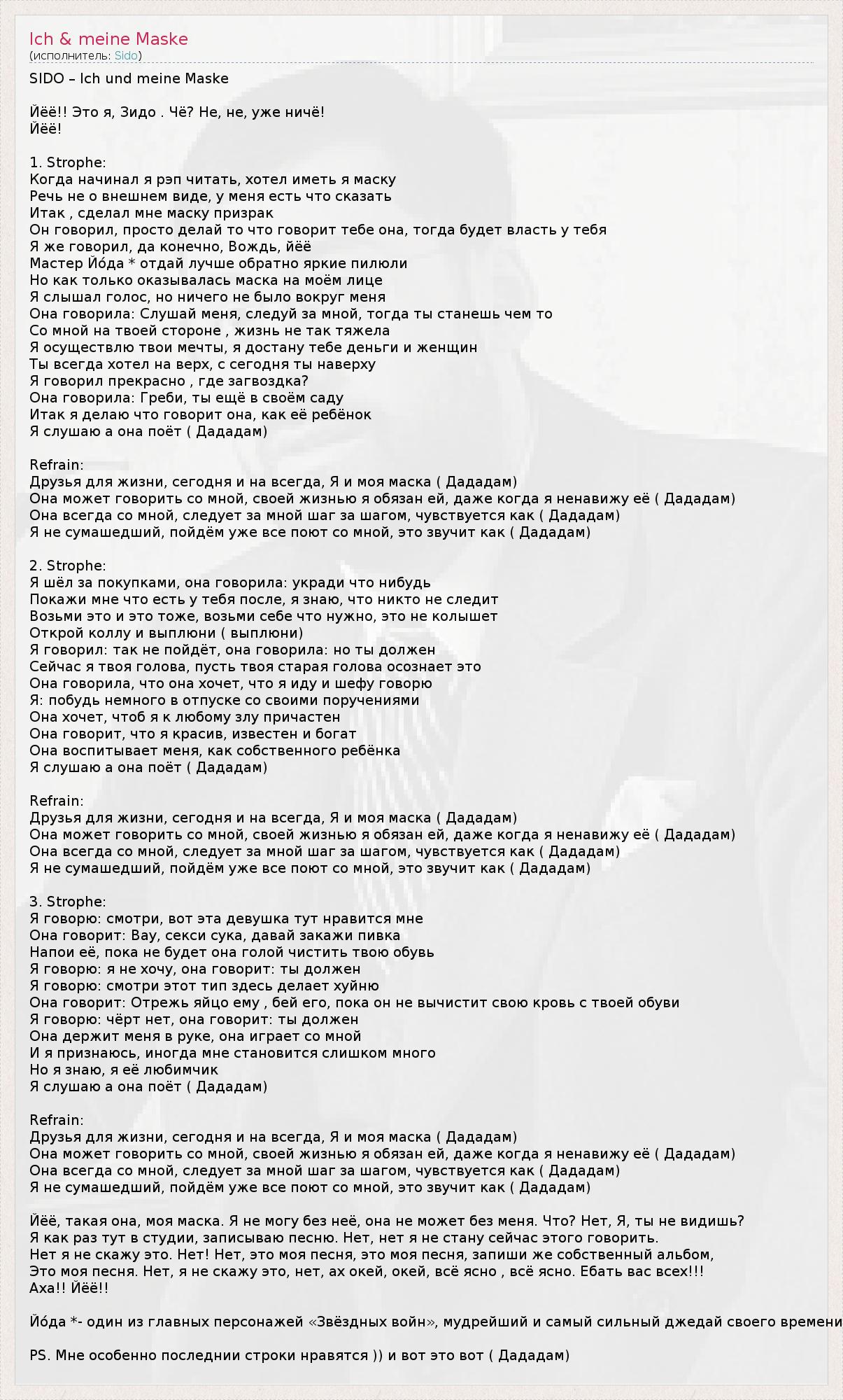 Это интересно:Sido родился 30 Ноября 1980 года в Берлине, настоящее имя Paul Wurdig. В 2001-2009 входил в немецкий лейбл Aggro Berlin.Sido отличается необычными агрессивными и провокационными текстами, но несмотря на это имеет лаконичный оттенок в голосе.Долгое время Sido вообще не снимал маску чтобы скрыть своё истинное лицо. Теперь он носит ее только как собственную визитную карточку.Sido рос с матерью и младшей... продолжение