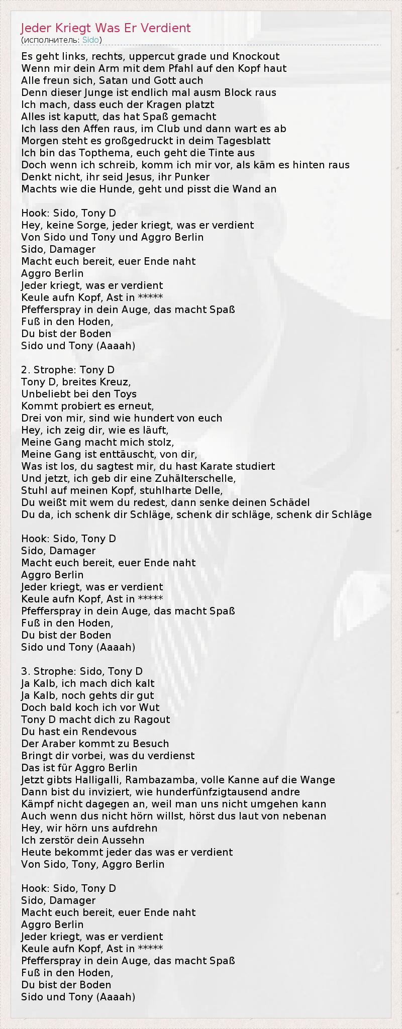 Es geht links, rechts, uppercut grade und Knockout Wenn mir dein Arm mit dem Pfahl auf den Kopf haut Alle freun sich, Satan und Gott auch Denn dieser Junge ist endlich mal ausm Block raus Ich mach, dass euch der Kragen platzt Alles ist kaputt, das hat Spaß gemacht Ich lass den Affen raus, im Club und dann wart es ab Morgen steht es großgedruckt in deim Tagesblatt Ich bin das Topthema, euch geht die Tinte aus Doch wenn ich schreib, komm ich mir vor, als käm es hinten raus Denkt nicht, ihr seid Jesus, ihr Punker Machts wie die Hunde, geht und pisst die Wand an Hook: Sido, Tony D Hey, keine Sorge, jeder kriegt, was er verdient Von Sido und Tony und Aggro Berlin Sido, Damager Macht euch bereit, euer Ende naht Aggro Berlin Jeder kriegt, was er verdient Keule aufn Kopf, Ast in ***** Pfefferspray in dein Auge, das macht Spaß Fuß in den Hoden, Du bist der Boden Sido und Tony (Aaaah) 2. Strophe: Tony D Tony D, breites Kreuz, Unbeliebt bei den Toys Kommt probiert es erneut, Drei von mir, sind wie hundert von euch Hey, ich zeig dir, wie es läuft, Meine Gang macht mich stolz, Meine Gang ist enttäuscht, von dir, Was ist los, du sagtest mir, du hast Karate studiert Und jetzt, ich geb dir eine Zuhälterschelle, Stuhl auf meinen Kopf, stuhlharte Delle, Du weißt mit wem du redest, dann senke deinen Schädel Du da, ich schenk dir Schläge, schenk dir schläge, schenk dir Schläge Hook: Sido, Tony D Sido, Damager Macht euch bereit, euer Ende naht Aggro Berlin Jeder kriegt, was er verdient Keule aufn Kopf, Ast in ***** Pfefferspray in dein Auge, das macht Spaß Fuß in den Hoden, Du bist der Boden Sido und Tony (Aaaah) 3. Strophe: Sido, Tony D Ja Kalb, ich mach dich kalt Ja Kalb, noch gehts dir gut Doch bald koch ich vor Wut Tony D macht dich zu Ragout Du hast ein Rendevous Der Araber kommt zu Besuch Bringt dir vorbei, was du verdienst Das ist für Aggro Berlin Jetzt gibts Halligalli, Rambazamba, volle Kanne auf die Wange Dann bist du inviziert, wie hunderfünfzigtausend andre Kämpf nicht dagegen an, weil man uns nicht umgehen kann Auch wenn dus nicht hörn willst, hörst dus laut von nebenan Hey, wir hörn uns aufdrehn Ich zerstör dein Aussehn Heute bekommt jeder das was er verdient Von Sido, Tony, Aggro Berlin Hook: Sido, Tony D Sido, Damager Macht euch bereit, euer Ende naht Aggro Berlin Jeder kriegt, was er verdient Keule aufn Kopf, Ast in ***** Pfefferspray in dein Auge, das macht Spaß Fuß in den Hoden, Du bist der Boden Sido und Tony (Aaaah)