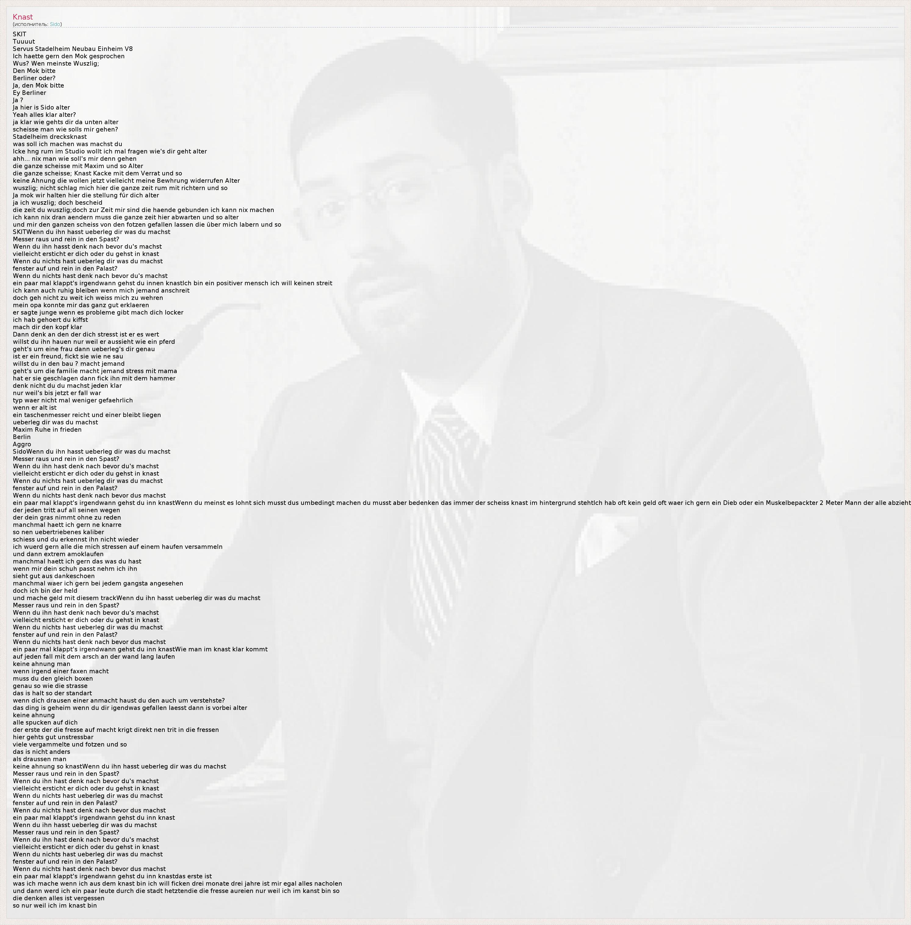 SKIT Tuuuut Servus Stadelheim Neubau Einheim V8 Ich haette gern den Mok gesprochen Wus? Wen meinste Wuszlig; Den Mok bitte Berliner oder? Ja, den Mok bitte Ey Berliner Ja ? Ja hier is Sido alter Yeah alles klar alter? ja klar wie gehts dir da unten alter scheisse man wie solls mir gehen? Stadelheim drecksknast was soll ich machen was machst du Icke hng rum im Studio wollt ich mal fragen wie's dir geht alter ahh... nix man wie soll's mir denn gehen die ganze scheisse mit Maxim und so Alter die ganze scheisse; Knast Kacke mit dem Verrat und so keine Ahnung die wollen jetzt vielleicht meine Bewhrung widerrufen Alter wuszlig; nicht schlag mich hier die ganze zeit rum mit richtern und so Ja mok wir halten hier die stellung für dich alter ja ich wuszlig; doch bescheid die zeit du wuszlig;doch zur Zeit mir sind die haende gebunden ich kann nix machen ich kann nix dran aendern muss die ganze zeit hier abwarten und so alter und mir den ganzen scheiss von den fotzen gefallen lassen die über mich labern und so SKITWenn du ihn hasst ueberleg dir was du machst Messer raus und rein in den Spast? Wenn du ihn hasst denk nach bevor du's machst vielleicht ersticht er dich oder du gehst in knast Wenn du nichts hast ueberleg dir was du machst fenster auf und rein in den Palast? Wenn du nichts hast denk nach bevor du's machst ein paar mal klappt's irgendwann gehst du innen knastIch bin ein positiver mensch ich will keinen streit ich kann auch ruhig bleiben wenn mich jemand anschreit doch geh nicht zu weit ich weiss mich zu wehren mein opa konnte mir das ganz gut erklaeren er sagte junge wenn es probleme gibt mach dich locker ich hab gehoert du kiffst mach dir den kopf klar Dann denk an den der dich stresst ist er es wert willst du ihn hauen nur weil er aussieht wie ein pferd geht's um eine frau dann ueberleg's dir genau ist er ein freund, fickt sie wie ne sau willst du in den bau ? macht jemand geht's um die familie macht jemand stress mit mama hat er sie geschlagen dann fick ihn mit dem hammer denk nicht du du machst jeden klar nur weil's bis jetzt er fall war typ waer nicht mal weniger gefaehrlich wenn er alt ist ein taschenmesser reicht und einer bleibt liegen ueberleg dir was du machst Maxim Ruhe in frieden Berlin Aggro SidoWenn du ihn hasst ueberleg dir was du machst Messer raus und rein in den Spast? Wenn du ihn hast denk nach bevor du's machst vielleicht ersticht er dich oder du gehst in knast Wenn du nichts hast ueberleg dir was du machst fenster auf und rein in den Palast? Wenn du nichts hast denk nach bevor dus machst ein paar mal klappt's irgendwann gehst du inn knastWenn du meinst es lohnt sich musst dus umbedingt machen du musst aber bedenken das immer der scheiss knast im hintergrund stehtIch hab oft kein geld oft waer ich gern ein Dieb oder ein Muskelbepackter 2 Meter Mann der alle abzieht der jeden tritt auf all seinen wegen der dein gras nimmt ohne zu reden manchmal haett ich gern ne knarre so nen uebertriebenes kaliber schiess und du erkennst ihn nicht wieder ich wuerd gern alle die mich stressen auf einem haufen versammeln und dann extrem amoklaufen manchmal haett ich gern das was du hast wenn mir dein schuh passt nehm ich ihn sieht gut aus dankeschoen manchmal waer ich gern bei jedem gangsta angesehen doch ich bin der held und mache geld mit diesem trackWenn du ihn hasst ueberleg dir was du machst Messer raus und rein in den Spast? Wenn du ihn hast denk nach bevor du's machst vielleicht ersticht er dich oder du gehst in knast Wenn du nichts hast ueberleg dir was du machst fenster auf und rein in den Palast? Wenn du nichts hast denk nach bevor dus machst ein paar mal klappt's irgendwann gehst du inn knastWie man im knast klar kommt auf jeden fall mit dem arsch an der wand lang laufen keine ahnung man wenn irgend einer faxen macht muss du den gleich boxen genau so wie die strasse das is halt so der standart wenn dich drausen einer anmacht haust du den auch um verstehste? das ding is geheim wenn du dir igendwas gefallen laesst dann is vorbei alter keine ahnung alle spucken auf dich der erste der die fresse auf macht krigt direkt nen trit in die fressen hier gehts gut unstressbar viele vergammelte und fotzen und so das is nicht anders als draussen man keine ahnung so knastWenn du ihn hasst ueberleg dir was du machst Messer raus und rein in den Spast? Wenn du ihn hast denk nach bevor du's machst vielleicht ersticht er dich oder du gehst in knast Wenn du nichts hast ueberleg dir was du machst fenster auf und rein in den Palast? Wenn du nichts hast denk nach bevor dus machst ein paar mal klappt's irgendwann gehst du inn knast Wenn du ihn hasst ueberleg dir was du machst Messer raus und rein in den Spast? Wenn du ihn hast denk nach bevor du's machst vielleicht ersticht er dich oder du gehst in knast Wenn du nichts hast ueberleg dir was du machst fenster auf und rein in den Palast? Wenn du nichts hast denk nach bevor dus machst ein paar mal klappt's irgendwann gehst du inn knastdas erste ist was ich mache wenn ich aus dem knast bin ich will ficken drei monate drei jahre ist mir egal alles nacholen und dann werd ich ein paar leute durch die stadt hetztendie die fresse aureien nur weil ich im kanst bin so die denken alles ist vergessen so nur weil ich im knast bin
