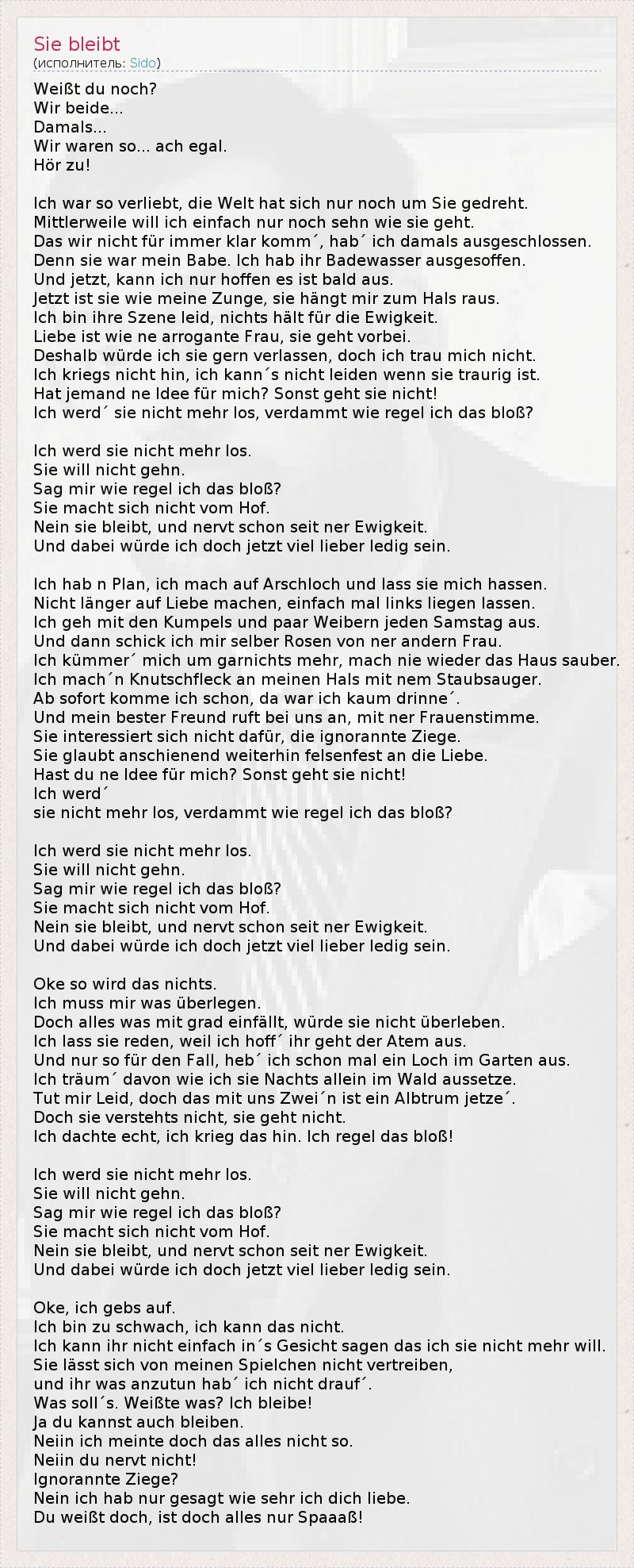 Do you remember? We both ... At that time ... We were so ... oh whatever . Listen ! I was so in love , the world has just turned them around . Meanwhile, I just want to still see how it goes . We do not forever come clear ' , I have then excluded. Because she was my baby . I've been open to her bath water. And now, I can only hope it will soon be over . Now she is like my tongue , she hangs me out to the neck . I'm sorry her scene , nothing lasts forever. Love 's like a arrogant woman , she passes . Therefore, I would like to leave, but I do not trust myself . I war not go , I can not stand when she's sad . Does anyone have an idea for me ? Otherwise it does not work! I'll not let go , damn how I rule the mere ? I 'll go no more . You do not want to go . Tell me how I rule the mere ? It makes not the court. No remains , and annoying since ner eternity. And I would but now much rather be single. I n plan , I'll do to asshole and let them hate me. No longer do to love, simply leave time left. I'll go with your mates and few women from every Saturday. And then I send myself roses by Ner another woman . I 'll take care of me nothing more , never do again clean the house. I mach'n hickey on my neck with NEM vacuum cleaner. From now on I 'm coming , I was hardly drinne ' . And my best friend calls to us , with ner woman's voice . She is not interested in that ignorannte goat. She believes anschienend still firmly in love. Do you have an idea for me? Otherwise it does not work! I'll they do not let go , damn how I rule the mere ? I 'll go no more . You do not want to go . Tell me how I rule the mere ? It makes not the court. No remains , and annoying since ner eternity. And I would but now much rather be single. Oke so this is nothing . I have to think of something. But everything is incident with degree, they would not survive. I let them talk because I hope ' you go out of breath. And just as in the case I raise , here's a hole in the garden. I dream of how I alone at night in the forest intermittent . I'm sorry , but that with us Zwei'n is a Albtrum jetze ' . But they verstehts not, they can not. I really thought I get the out . I rule the mere ! I 'll go no more . You do not want to go . Tell me how I rule the mere ? It makes not the court. No remains , and annoying since ner eternity. And I would but now much rather be single. Oke , I gebs on . I'm too weak, I can not. I can not you just say that to my face I no longer want. You can not sell my games , and ' I do not it ' told her what to do to . What the heck. Y'know what? I'm staying ! Yes, you can stay. Neiin what I meant everything not so. Neiin you not annoying! Ignorannte goat? No, I 've only said how much I love you. You know , but everything is just Spaaaß !