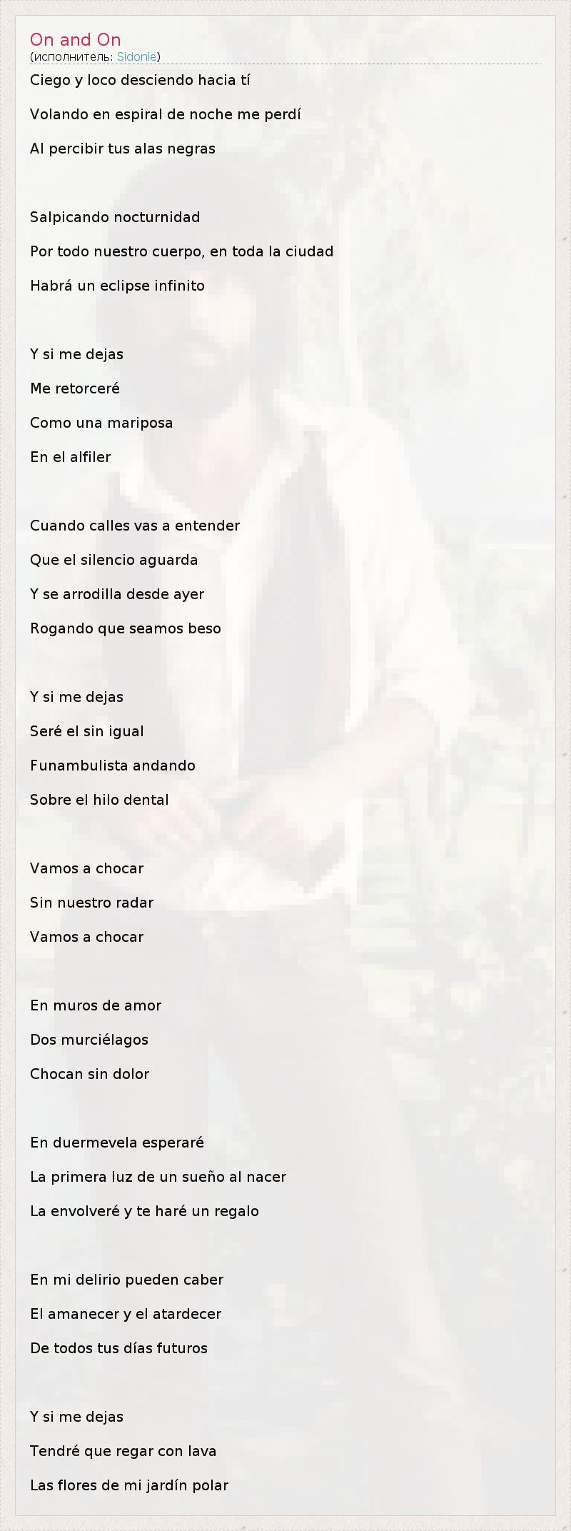 Ciego y loco desciendo hacia tí Volando en espiral de noche me perdí Al percibir tus alas negras Salpicando nocturnidad Por todo nuestro cuerpo, en toda la ciudad Habrá un eclipse infinito Y si me dejas Me retorceré Como una mariposa En el alfiler Cuando calles vas a entender Que el silencio aguarda Y se arrodilla desde ayer Rogando que seamos beso Y si me dejas Seré el sin igual Funambulista andando Sobre el hilo dental Vamos a chocar Sin nuestro radar Vamos a chocar En muros de amor Dos murciélagos Chocan sin dolor En duermevela esperaré La primera luz de un sueño al nacer La envolveré y te haré un regalo En mi delirio pueden caber El amanecer y el atardecer De todos tus días futuros Y si me dejas Tendré que regar con lava Las flores de mi jardín polar