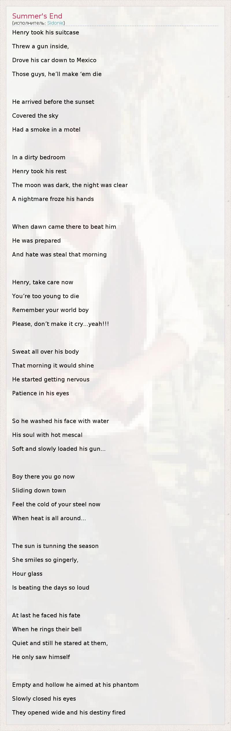 Henry took his suitcase Threw a gun inside, Drove his car down to Mexico Those guys, he’ll make ‘em die He arrived before the sunset Covered the sky Had a smoke in a motel In a dirty bedroom Henry took his rest The moon was dark, the night was clear A nightmare froze his hands When dawn came there to beat him He was prepared And hate was steal that morning Henry, take care now You’re too young to die Remember your world boy Please, don’t make it cry...yeah!!! Sweat all over his body That morning it would shine He started getting nervous Patience in his eyes So he washed his face with water His soul with hot mescal Soft and slowly loaded his gun... Boy there you go now Sliding down town Feel the cold of your steel now When heat is all around... The sun is tunning the season She smiles so gingerly, Hour glass Is beating the days so loud At last he faced his fate When he rings their bell Quiet and still he stared at them, He only saw himself Empty and hollow he aimed at his phantom Slowly closed his eyes They opened wide and his destiny fired