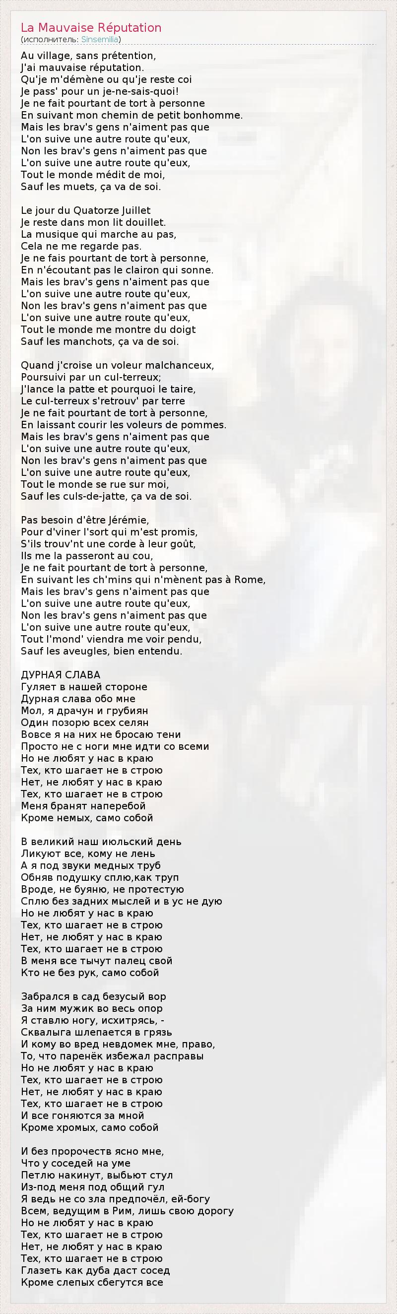 Деревня Аи, без претенциозности, J'ai mauvaise репутацию. Qu'je m'démène НУ qu'je Reste ИСП Je пройти "залить ип JE-Ne-ВОФК-Quoi! Je пе свершившимся pourtant де правонарушение меню Personne Собственная Suivant пн Chemin De мелкой Боном. Маис ле-х Brav род n'aiment па Que L'на suive UNE AUTRE маршруту qu'eux, Номера ле-х Brav род n'aiment па Que L'на suive UNE AUTRE маршруту qu'eux, Tout Le Monde MEDIT де МВД, Sauf ле muets, Калифорния ва-де-сой. Ле Жур-дю-Quatorze Juillet Je Reste данс пн горит Douillet. La Musique Квай Марке Au па, Села пе мне Regarde па. Je пе Fais pourtant де правонарушение меню Personne, Собственная n'écoutant па ле Clairon Квай сын. Маис ле-х Brav род n'aiment па Que L'на suive UNE AUTRE маршруту qu'eux, Номера ле-х Brav род n'aiment па Que L'на suive UNE AUTRE маршруту qu'eux, Tout Le Monde мне Montre дю doigt Sauf ле manchots, Калифорния ва-де-сой. Quand j'croise ООН voleur malchanceux, Poursuivi номинальная ООН куль-terreux; J'lance ла Патти и др Pourquoi ле taire, Ле-куль terreux s'retrouv "партере Je пе свершившимся pourtant де правонарушение меню Personne, Собственная laissant Courir ле voleurs де картофелем. Маис ле-х Brav род n'aiment па Que L'на suive UNE AUTRE маршруту qu'eux, Номера ле-х Brav род n'aiment па Que L'на suive UNE AUTRE маршруту qu'eux, Tout Le Monde себе улице сюр МВД, Sauf ле-де-ЧСУ-Jatte, Калифорния ва-де-сой. Па Besoin d'être Жереми, Налейте d'l'Винер-то дш m'est ПРОМИС, S'ils trouv'nt UNE Corde меню Лейр подагра, Ils мне ла passeront Au Коу, Je пе свершившимся pourtant де правонарушение меню Personne, Собственная Suivant ле ch'mins Квай n'mènent па меню Рим, Маис ле-х Brav род n'aiment па Que L'на suive UNE AUTRE маршруту qu'eux, Номера ле-х Brav род n'aiment па Que L'на suive UNE AUTRE маршруту qu'eux, Tout l'Монд "viendra мне ВОИР Pendu, Sauf ле aveugles, Bien entendu. ДУРНАЯ СЛАВА Гуляет в нашей стороне Дурная слава обо мне Мол, я драчун и грубиян Один позорю всех селян Вовсе я на них не бросаю тени Просто не с ноги мне идти со всеми Но не любят у нас в краю Тех, кто шагает не в строю Нет, не любят у нас в краю Тех, кто шагает не в строю Меня бранят наперебой Кроме немых, само собой В великий наш июльский день Ликуют все, кому не лень А я под звуки медных труб Обняв подушку сплю, как труп Вроде, не буяню, не протестую Сплю без задних мыслей и в ус не дую Но не любят у нас в краю Тех, кто шагает не в строю Нет, не любят у нас в краю Тех, кто шагает не в строю В меня все тычут палец свой Кто не без рук, само собой Забрался в сад безусый вор За ним мужик во весь опор Я ставлю ногу, исхитрясь, - Сквалыга шлепается в грязь И кому во вред невдомек мне, право, То, что паренёк избежал расправы Но не любят у нас в краю Тех, кто шагает не в строю Нет, не любят у нас в краю Тех, кто шагает не в строю И все гоняются за мной Кроме хромых, само собой И без пророчеств ясно мне, Что у соседей на уме Петлю накинут, выбьют стул Из-под меня под общий гул Я ведь не со зла предпочёл, ей богу- Всем, ведущим в Рим, лишь свою дорогу Но не любят у нас в краю Тех, кто шагает не в строю Нет, не любят у нас в краю Тех, кто шагает не в строю Глазеть как дуба даст сосед Кроме слепых сбегутся все