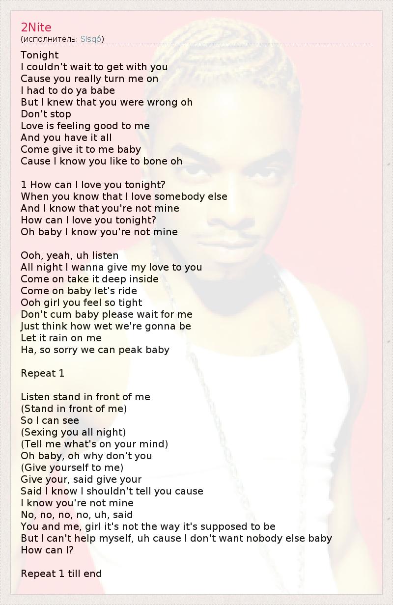 Tonight I couldn't wait to get with you Cause you really turn me on I had to do ya babe But I knew that you were wrong oh Don't stop Love is feeling good to me And you have it all Come give it to me baby Cause I know you like to bone oh 1 How can I love you tonight? When you know that I love somebody else And I know that you're not mine How can I love you tonight? Oh baby I know you're not mine Ooh, yeah, uh listen All night I wanna give my love to you Come on take it deep inside Come on baby let's ride Ooh girl you feel so tight Don't cum baby please wait for me Just think how wet we're gonna be Let it rain on me Ha, so sorry we can peak baby Repeat 1 Listen stand in front of me (Stand in front of me) So I can see (Sexing you all night) (Tell me what's on your mind) Oh baby, oh why don't you (Give yourself to me) Give your, said give your Said I know I shouldn't tell you cause I know you're not mine No, no, no, no, uh, said You and me, girl it's not the way it's supposed to be But I can't help myself, uh cause I don't want nobody else baby How can I? Repeat 1 till end