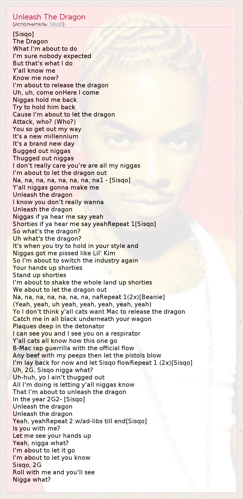 [Sisqo] The Dragon What I'm about to do I'm sure nobody expected But that's what I do Y'all know me Know me now? I'm about to release the dragon Uh, uh, come onHere I come Niggas hold me back Try to hold him back Cause I'm about to let the dragon Attack, who? (Who?) You so get out my way It's a new millennium It's a brand new day Bugged out niggas Thugged out niggas I don't really care you're are all my niggas I'm about to let the dragon out Na, na, na, na, na, na, na, na1 - [Sisqo] Y'all niggas gonna make me Unleash the dragon I know you don't really wanna Unleash the dragon Niggas if ya hear me say yeah Shorties if ya hear me say yeahRepeat 1[Sisqo] So what's the dragon? Uh what's the dragon? It's when you try to hold in your style and Niggas got me pissed like Lil' Kim So I'm about to switch the industry again Your hands up shorties Stand up shorties I'm about to shake the whole land up shorties We about to let the dragon out Na, na, na, na, na, na, na, naRepeat 1(2x)[Beanie] (Yeah, yeah, uh yeah, yeah, yeah, yeah, yeah) Yo I don't think y'all cats want Mac to release the dragon Catch me in all black underneath your wagon Plaques deep in the detonator I can see you and I see you on a respirator Y'all cats all know how this one go B-Mac rap guerrilla with the official flow Any beef with my peeps then let the pistols blow I'm lay back for now and let Sisqo flowRepeat 1 (2x)[Sisqo] Uh, 2G, Sisqo nigga what? Uh-huh, yo I ain't thugged out All I'm doing is letting y'all niggas know That I'm about to unleash the dragon In the year 2G2- [Sisqo] Unleash the dragon Unleash the dragon Yeah, yeahRepeat 2 w/ad-libs till end[Sisqo] Is you with me? Let me see your hands up Yeah, nigga what? I'm about to let it go I'm about to let you know Sisqo, 2G Roll with me and you'll see Nigga what?