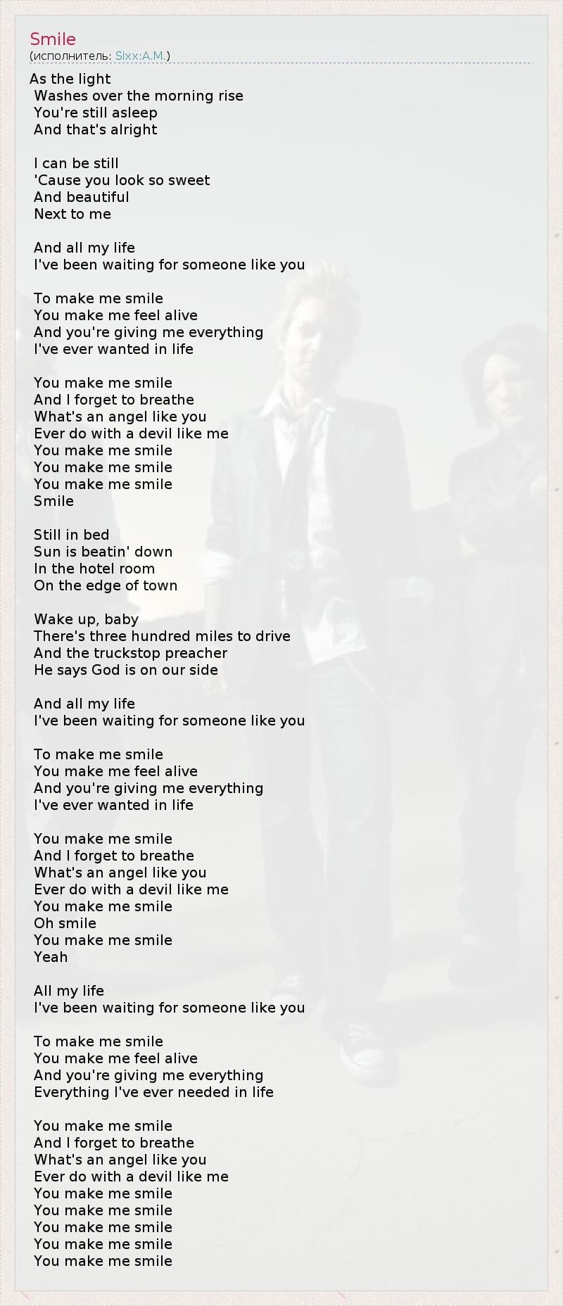 As the light Washes over the morning rise You're still asleep And that's alright I can be still 'Cause you look so sweet And beautiful Next to me And all my life I've been waiting for someone like you To make me smile You make me feel alive And you're giving me everything I've ever wanted in life You make me smile And I forget to breathe What's an angel like you Ever do with a devil like me You make me smile You make me smile You make me smile Smile Still in bed Sun is beatin' down In the hotel room On the edge of town Wake up, baby There's three hundred miles to drive And the truckstop preacher He says God is on our side And all my life I've been waiting for someone like you To make me smile You make me feel alive And you're giving me everything I've ever wanted in life You make me smile And I forget to breathe What's an angel like you Ever do with a devil like me You make me smile Oh smile You make me smile Yeah All my life I've been waiting for someone like you To make me smile You make me feel alive And you're giving me everything Everything I've ever needed in life You make me smile And I forget to breathe What's an angel like you Ever do with a devil like me You make me smile You make me smile You make me smile You make me smile You make me smile