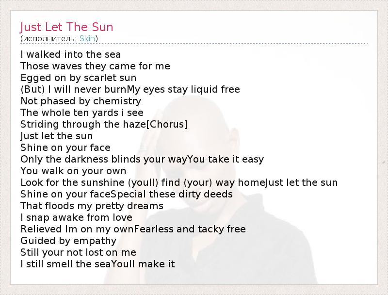I walked into the sea Those waves they came for me Egged on by scarlet sun (But) I will never burnMy eyes stay liquid free Not phased by chemistry The whole ten yards i see Striding through the haze[Chorus] Just let the sun Shine on your face Only the darkness blinds your wayYou take it easy You walk on your own Look for the sunshine (youll) find (your) way homeJust let the sun Shine on your faceSpecial these dirty deeds That floods my pretty dreams I snap awake from love Relieved Im on my ownFearless and tacky free Guided by empathy Still your not lost on me I still smell the seaYoull make it