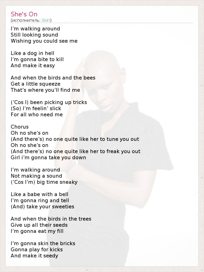 I’m walking around Still looking sound Wishing you could see me Like a dog in hell I’m gonna bite to kill And make it easy And when the birds and the bees Get a little squeeze That’s where you’ll find me (’Cos I) been picking up tricks (So) I’m feelin’ slick For all who need me Chorus Oh no she’s on (And there’s) no one quite like her to tune you out Oh no she’s on (And there’s) no one quite like her to freak you out Girl i’m gonna take you down I’m walking around Not making a sound (’Cos I’m) big time sneaky Like a babe with a bell I’m gonna ring and tell (And) take your sweeties And when the birds in the trees Give up all their seeds I’m gonna eat my fill I’m gonna skin the bricks Gonna play for kicks And make it seedy