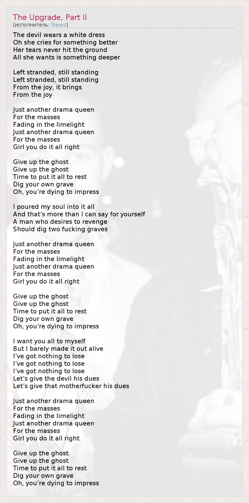 The devil wears a white dress Oh she cries for something better Her tears never hit the ground All she wants is something deeper Left stranded, still standing Left stranded, still standing From the joy, it brings From the joy Just another drama queen For the masses Fading in the limelight Just another drama queen For the masses Girl you do it all right Give up the ghost Give up the ghost Time to put it all to rest Dig your own grave Oh, you’re dying to impress I poured my soul into it all And that’s more than I can say for yourself A man who desires to revenge Should dig two fucking graves Just another drama queen For the masses Fading in the limelight Just another drama queen For the masses Girl you do it all right Give up the ghost Give up the ghost Time to put it all to rest Dig your own grave Oh, you’re dying to impress I want you all to myself But I barely made it out alive I’ve got nothing to lose I’ve got nothing to lose I’ve got nothing to lose Let’s give the devil his dues Let’s give that motherfucker his dues Just another drama queen For the masses Fading in the limelight Just another drama queen For the masses Girl you do it all right Give up the ghost Give up the ghost Time to put it all to rest Dig your own grave Oh, you’re dying to impress