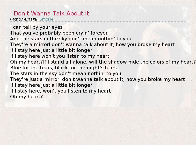 А как ты думаешь, о чем песня "I Don't Wanna Talk About It" ?