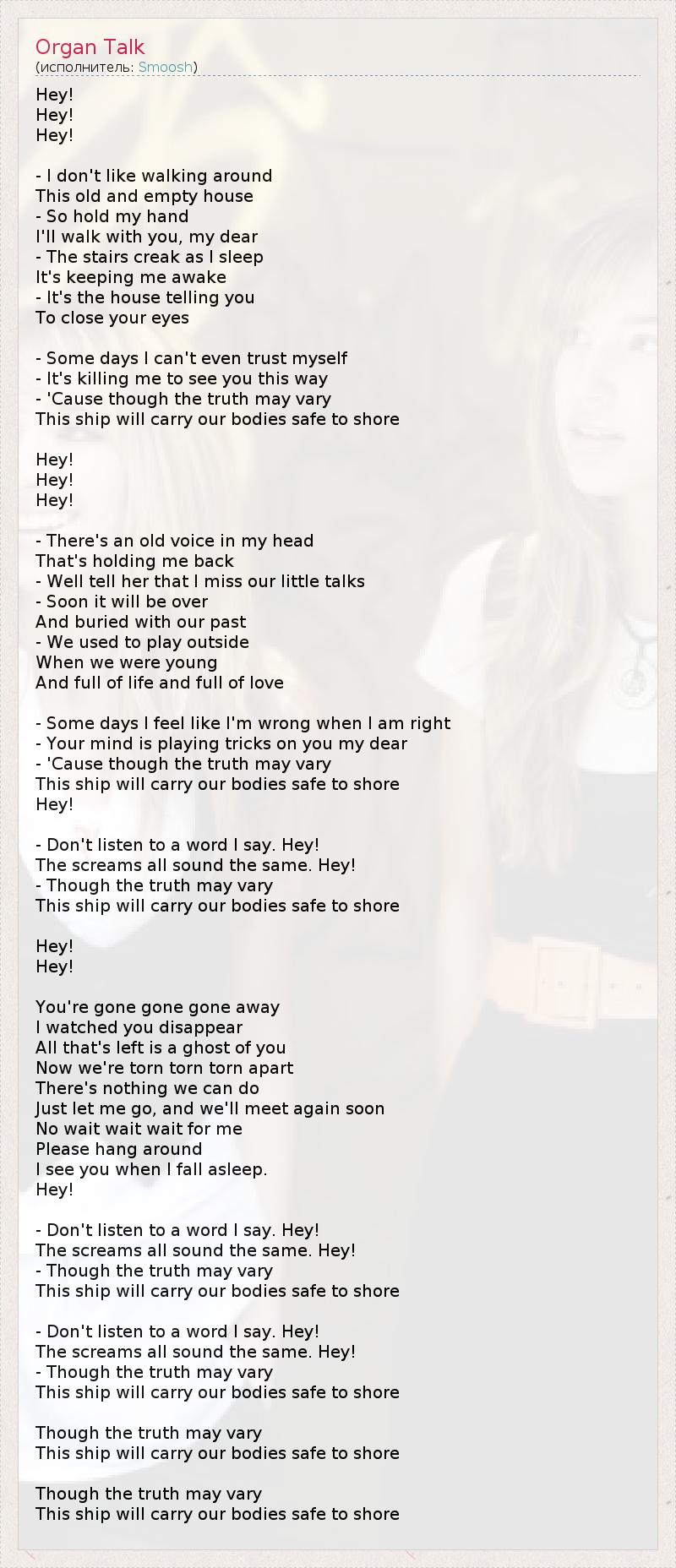 Хэй! Хэй! Хэй! - Я не люблю бродить вокруг Этого старого пустого дома. - Так возьми меня за руку, Пройдёмся вместе, дорогая. - Скрип ступенек Не даёт мне уснуть. - Это дом подсказывает тебе Закрыть глаза. - Порой я даже себе не доверяю. - Меня убивает видеть тебя такой. - И хотя правда переменчива, Корабль этот доставит нас к берегу невредимыми. Хэй! Хэй! Хэй! - В голове знакомый голос, Который не отпускает меня. - Что ж, скажи ей, что мне не хватает небольших бесед. - Скоро всё будет кончено, Похоронено вместе с нашим прошлым. - Будучи юнцами, Мы играли во дворе И были полны жизни и любви. - Порой я чувствую, будто неправа, хотя это не так. - Твой разум играет с тобой, дорогая. - И хотя правда переменчива, Корабль этот доставит нас к берегу невредимыми. Хэй! - Не обращай внимания на мои слова. Хэй! Все вопли похожи. Хэй! - И хотя правда переменчива, Корабль этот доставит нас к берегу невредимыми. Хэй! Хэй! Ты ушёл, покинул меня, И я видела, как ты исчезаешь - Кроме твоего призрака ничего не осталось. Теперь мы не вместе, расстались, И ничего с этим не поделать - Просто отпусти меня, и вскоре мы вновь встретимся. Нет, подожди меня, постой, Прошу, будь рядом - Я вижу тебя в своих снах. Хэй! - Не обращай внимания на мои слова. Хэй! Все вопли похожи. Хэй! - И хотя правда переменчива, Корабль этот доставит нас к берегу невредимыми. - Не обращай внимания на мои слова. Хэй! Все вопли похожи. Хэй! - И хотя правда переменчива, Корабль этот доставит нас к берегу невредимыми. И хотя правда переменчива, Корабль этот доставит нас к берегу невредимыми. И хотя правда переменчива, Корабль этот доставит нас к берегу невредимыми.