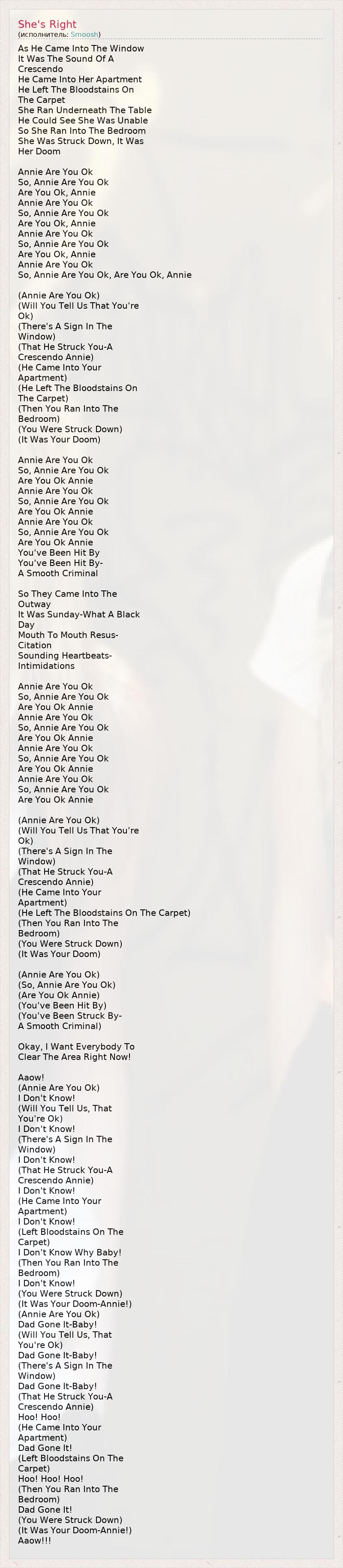 Когда он проник через окно, Это был звук крещендо. Он проник в ее квартиру И оставил пятна крови на ковре. Она спряталась под столом, Она была беспомощна,он мог видеть это. После она убежала в спальню, Ужас охватил ее, это был ее смертный приговор. Энни,ты в порядке? Ну,Энни,ты в порядке? Ты в порядке,Энни? Энни,ты в порядке? Ну,Энни,ты в порядке? Ты в порядке,Энни? Энни,ты в порядке? Ну,Энни,ты в порядке? Ты в порядке,Энни? Энни,ты в порядке? Ну,Энни,ты в порядке?Ты в порядке,Энни? Энни,ты в порядке? Скажешь ли нам,что ты в порядке? Там знак в окне, Что он напугал тебя - крещендо,Энни. Он проник в твою квартиру, Оставил следы крови на ковре. Затем ты убежала в спальню, Ты была охвачена ужасом, Это оказалось твоим смертным приговором. Энни,ты в порядке? Ну,Энни,ты в порядке? Ты в порядке,Энни? Энни,ты в порядке? Ну,Энни,ты в порядке? Ты в порядке,Энни? Энни,ты в порядке? Ну,Энни,ты в порядке? Ты в порядке,Энни? Ты подверглась нападению, Ты подверглась нападению - Ловкого преступника. Итак они вышли на внедорожье. Было воскресенье - что за проклятый день. Реанимация - рот в рот. Громкие биения сердца - запугивание. Энни,ты в порядке? Ну,Энни,ты в порядке? Ты в порядке,Энни? Энни,ты в порядке? Ну,Энни,ты в порядке? Ты в порядке,Энни? Энни,ты в порядке? Ну,Энни,ты в порядке? Ты в порядке,Энни? Энни,ты в порядке? Ну,Энни,ты в порядке?Ты в порядке,Энни? Энни,ты в порядке? Скажешь ли нам,что ты в порядке? Там знак в окне, Что он напугал тебя - крещендо,Энни. Он проник в твою квартиру, Оставил следы крови на ковре. Затем ты убежала в спальню, Ты была охвачена ужасом, Это оказалось твоим смертным приговором. Энни,ты в порядке? Ну,Энни,ты в порядке? Ты в порядке,Энни? Ты подверглась нападению, Ты подверглась нападению - Ловкого преступника. Okey, я хочу,чтобы все освободили пространство прямо сейчас. Aouw! (Энни,ты в порядке?) Я не знаю! (Скажешь ли нам,что ты в порядке?) Я не знаю! (Там знак в окне) Я не знаю! (Что он напугал тебя - крещендо,Энни) Я не знаю! (Он проник в твою квартиру) Я не знаю! (Оставил следы крови на ковре) Я не знаю почему, детка! (Затем ты убежала в спальню) Я не знаю (Ты была охвачена ужасом) (Это оказалось твоим смертным приговором,Энни!) (Энни,ты в порядке?) Папочка прогнал это,детка! (Скажешь ли нам,что ты в порядке?) Папочка прогнал это,детка! (Там знак в окне) Папочка прогнал это,детка! (Что он напугал тебя - крещендо,Энни) Hoo!Hoo! (Он проник в твою квартиру) Папочка прогнал это! (Оставил следы крови на ковре) Hoo!Hoo!Hoo! (Затем ты убежала в спальню) Папочка прогнал это! (Ты была охвачена ужасом) (Это оказалось твоим смертным приговором,Энни!) Aouw!!!