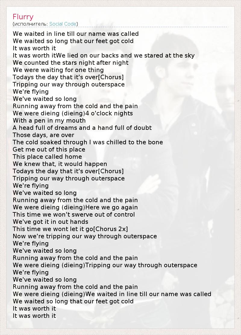 We waited in line till our name was called We waited so long that our feet got cold It was worth it It was worth itWe lied on our backs and we stared at the sky We counted the stars night after night We were waiting for one thing Todays the day that it's over[Chorus] Tripping our way through outerspace We're flying We've waited so long Running away from the cold and the pain We were dieing (dieing)4 o'clock nights With a pen in my mouth A head full of dreams and a hand full of doubt Those days, are over The cold soaked through I was chilled to the bone Get me out of this place This place called home We knew that, it would happen Todays the day that it's over[Chorus] Tripping our way through outerspace We're flying We've waited so long Running away from the cold and the pain We were dieing (dieing)Here we go again This time we won't swerve out of control We've got it in out hands This time we wont let it go[Chorus 2x] Now we're tripping our way through outerspace We're flying We've waited so long Running away from the cold and the pain We were dieing (dieing)Tripping our way through outerspace We're flying We've waited so long Running away from the cold and the pain We were dieing (dieing)We waited in line till our name was called We waited so long that our feet got cold It was worth it It was worth it