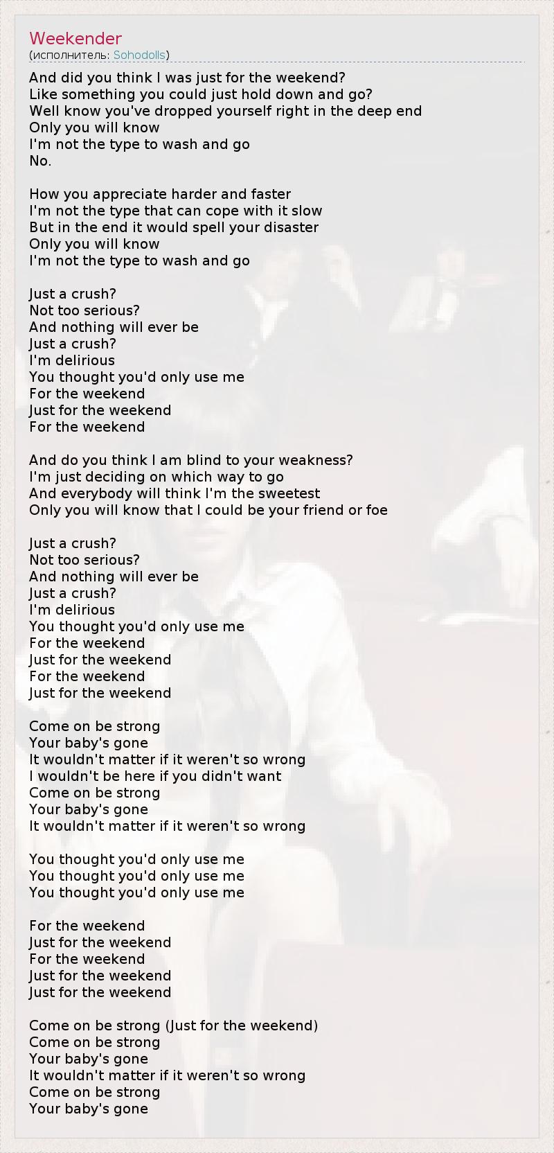Ты считал меня лишь интрижкой на один выходной? Тем, чем можно попользоваться и бросить? Что ж, знай, что ты отшвырнул себя в самый дальний угол, Лишь ты узнаешь, Что от таких, как я, быстро не отделаться, Нет. Как ты оцениваешь силу и скорость? Я не из тех, кто долго возится на месте, Но в конце концов для тебя все может кончиться катастрофой, Лишь ты узнаешь, Что от таких, как я, быстро не отделаться... Просто интрижка? Не слишком серьезная? И никогда ничего не будет... Просто интрижка? Я вне себя, Ты думал, что лишь воспользовался мной По случаю выходного, Лишь на выходной, На выходной... Думаешь, я так слепа, что не заметила твоих слабостей? Я просто решаю, какой дорогой пойти, Все будут думать, что я - милейшее создание, Лишь ты узнаешь, что я могу быть как другом, так и врагом... Просто интрижка? Не слишком серьезная? И никогда ничего не будет... Просто интрижка? Я вне себя, Ты думал, что лишь воспользовался мной По случаю выходного, Лишь на выходной, На выходной, Лишь на выходной. Давай, будь сильным, Твоя малышка ушла, Не будь это неправильным, в этом не было бы смысла, Меня бы не было здесь, если бы ты не хотел, Давай, будь сильным, Твоя малышка ушла, Не будь это неправильным, в этом не было бы смысла... Ты думал, что лишь воспользовался мной, Ты думал, что лишь воспользовался мной, Ты думал, что лишь воспользовался мной, По случаю выходного, Лишь на выходной, На выходной, Лишь на выходной, Лишь на выходной. Давай, будь сильным (Лишь на выходной) Давай, будь сильным, Твоя малышка ушла, Не будь это неправильным, в этом не было бы смысла... Давай, будь сильным, Твоя малышка ушла. * Сленговое обозначение людей, которые всю неделю где-то пропадают и появляются только к выходным.