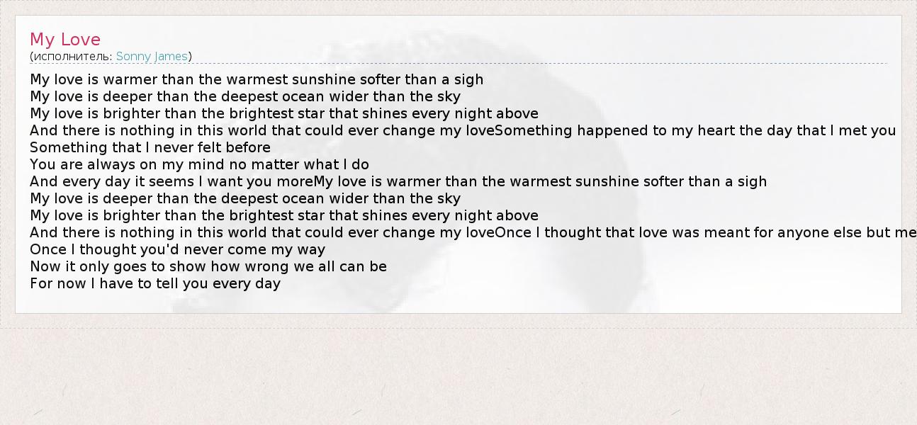 My love is warmer than the warmest sunshine softer than a sigh My love is deeper than the deepest ocean wider than the sky My love is brighter than the brightest star that shines every night above And there is nothing in this world that could ever change my loveSomething happened to my heart the day that I met you Something that I never felt before You are always on my mind no matter what I do And every day it seems I want you moreMy love is warmer than the warmest sunshine softer than a sigh My love is deeper than the deepest ocean wider than the sky My love is brighter than the brightest star that shines every night above And there is nothing in this world that could ever change my loveOnce I thought that love was meant for anyone else but me Once I thought you'd never come my way Now it only goes to show how wrong we all can be For now I have to tell you every day