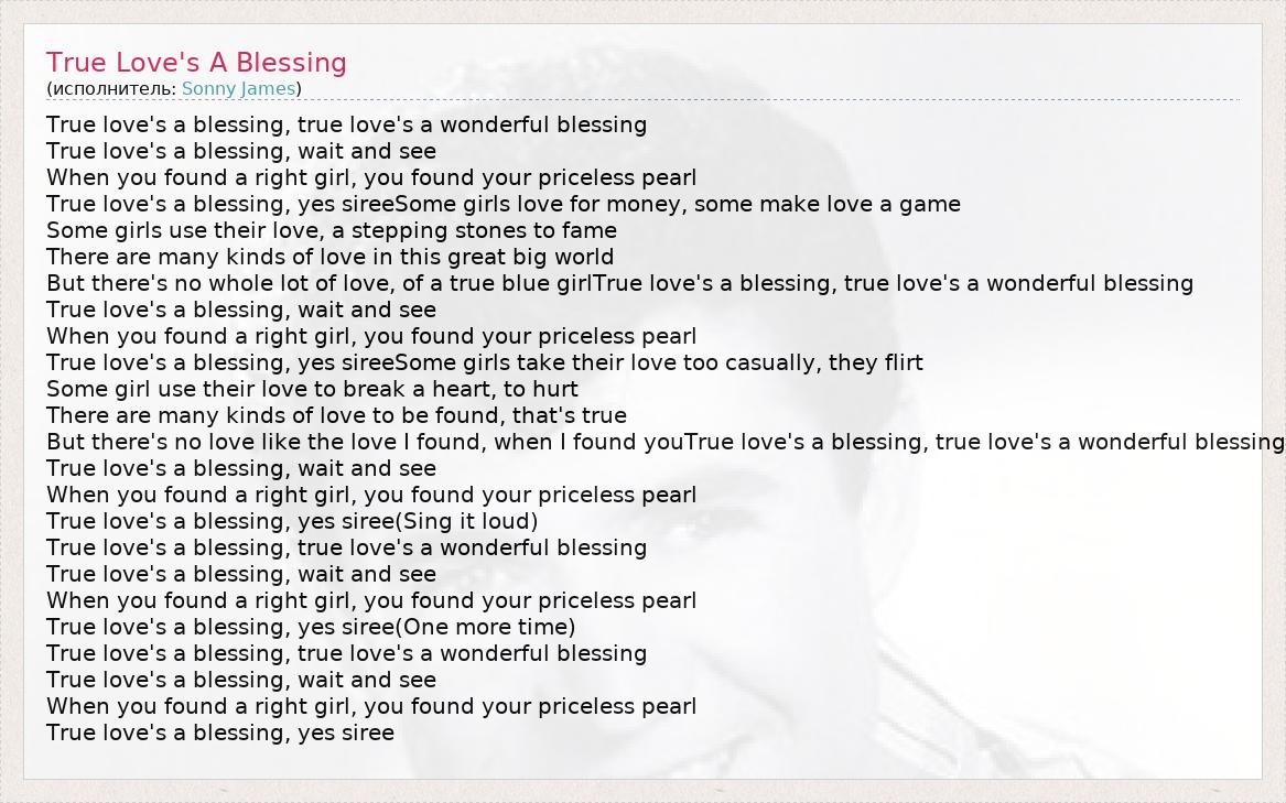 True love's a blessing, true love's a wonderful blessing True love's a blessing, wait and see When you found a right girl, you found your priceless pearl True love's a blessing, yes sireeSome girls love for money, some make love a game Some girls use their love, a stepping stones to fame There are many kinds of love in this great big world But there's no whole lot of love, of a true blue girlTrue love's a blessing, true love's a wonderful blessing True love's a blessing, wait and see When you found a right girl, you found your priceless pearl True love's a blessing, yes sireeSome girls take their love too casually, they flirt Some girl use their love to break a heart, to hurt There are many kinds of love to be found, that's true But there's no love like the love I found, when I found youTrue love's a blessing, true love's a wonderful blessing True love's a blessing, wait and see When you found a right girl, you found your priceless pearl True love's a blessing, yes siree(Sing it loud) True love's a blessing, true love's a wonderful blessing True love's a blessing, wait and see When you found a right girl, you found your priceless pearl True love's a blessing, yes siree(One more time) True love's a blessing, true love's a wonderful blessing True love's a blessing, wait and see When you found a right girl, you found your priceless pearl True love's a blessing, yes siree