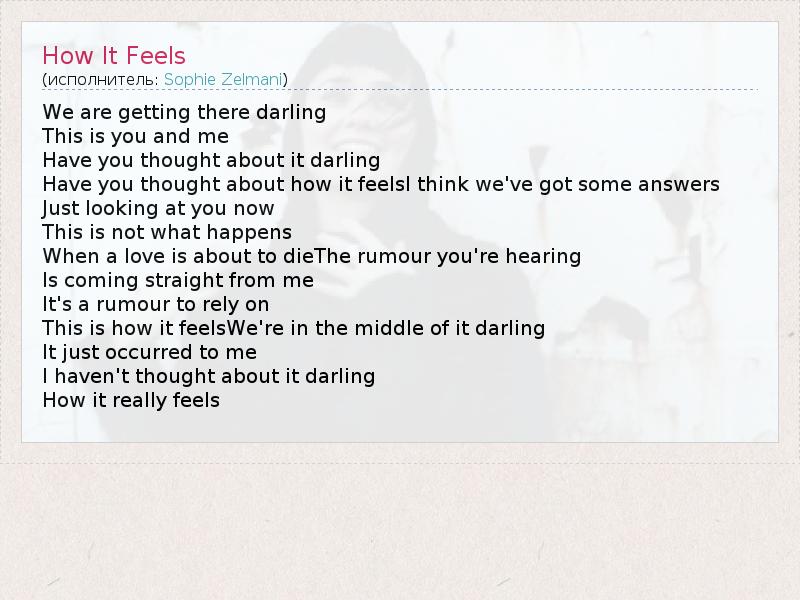 We are getting there darling This is you and me Have you thought about it darling Have you thought about how it feelsI think we've got some answers Just looking at you now This is not what happens When a love is about to dieThe rumour you're hearing Is coming straight from me It's a rumour to rely on This is how it feelsWe're in the middle of it darling It just occurred to me I haven't thought about it darling How it really feels