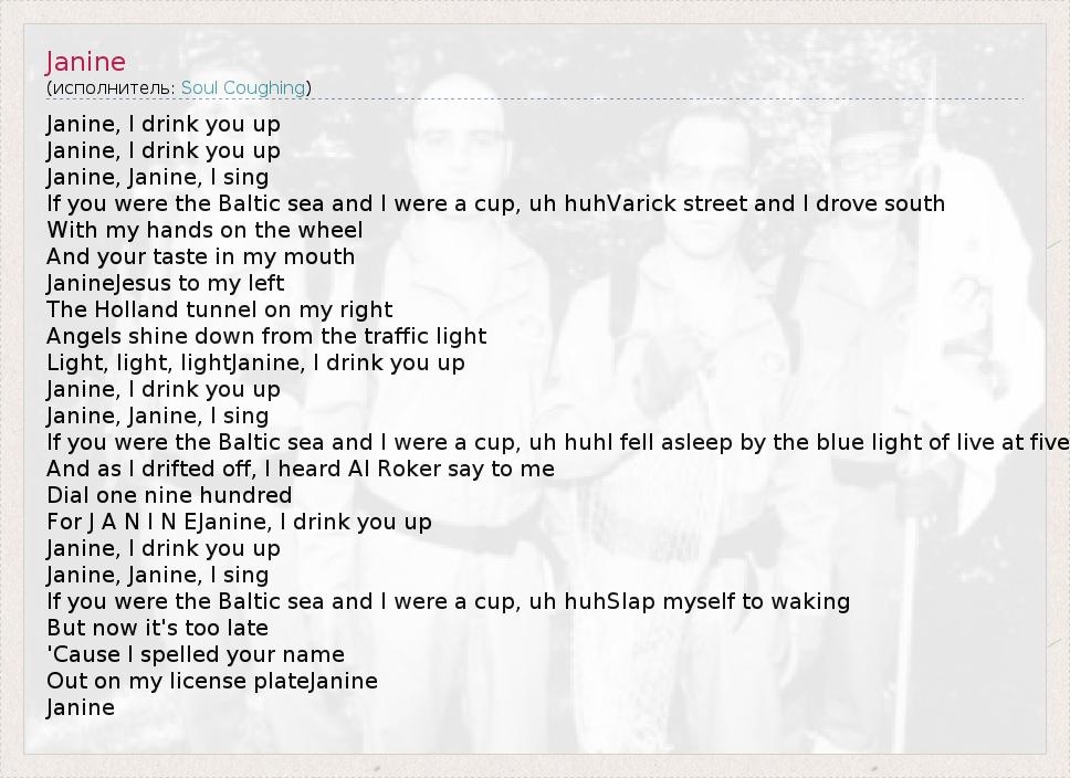 Janine, I drink you up Janine, I drink you up Janine, Janine, I sing If you were the Baltic sea and I were a cup, uh huhVarick street and I drove south With my hands on the wheel And your taste in my mouth JanineJesus to my left The Holland tunnel on my right Angels shine down from the traffic light Light, light, lightJanine, I drink you up Janine, I drink you up Janine, Janine, I sing If you were the Baltic sea and I were a cup, uh huhI fell asleep by the blue light of live at five And as I drifted off, I heard Al Roker say to me Dial one nine hundred For J A N I N EJanine, I drink you up Janine, I drink you up Janine, Janine, I sing If you were the Baltic sea and I were a cup, uh huhSlap myself to waking But now it's too late 'Cause I spelled your name Out on my license plateJanine Janine