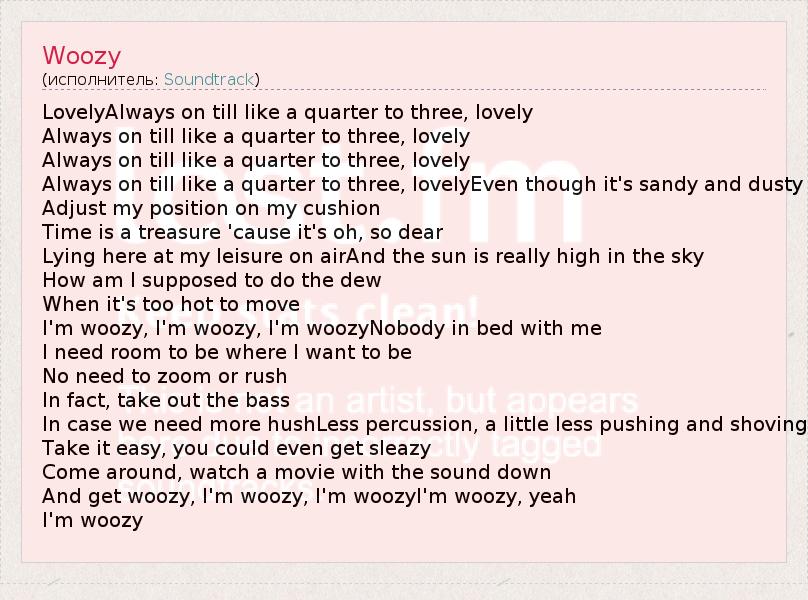 LovelyAlways on till like a quarter to three, lovely Always on till like a quarter to three, lovely Always on till like a quarter to three, lovely Always on till like a quarter to three, lovelyEven though it's sandy and dusty Adjust my position on my cushion Time is a treasure 'cause it's oh, so dear Lying here at my leisure on airAnd the sun is really high in the sky How am I supposed to do the dew When it's too hot to move I'm woozy, I'm woozy, I'm woozyNobody in bed with me I need room to be where I want to be No need to zoom or rush In fact, take out the bass In case we need more hushLess percussion, a little less pushing and shoving Take it easy, you could even get sleazy Come around, watch a movie with the sound down And get woozy, I'm woozy, I'm woozyI'm woozy, yeah I'm woozy