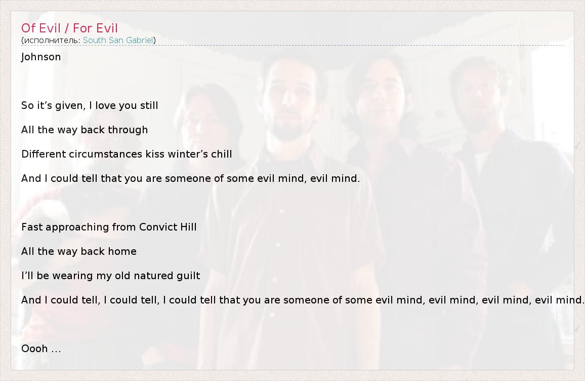 Johnson So it’s given, I love you still All the way back through Different circumstances kiss winter’s chill And I could tell that you are someone of some evil mind, evil mind. Fast approaching from Convict Hill All the way back home I’ll be wearing my old natured guilt And I could tell, I could tell, I could tell that you are someone of some evil mind, evil mind, evil mind, evil mind. Oooh …