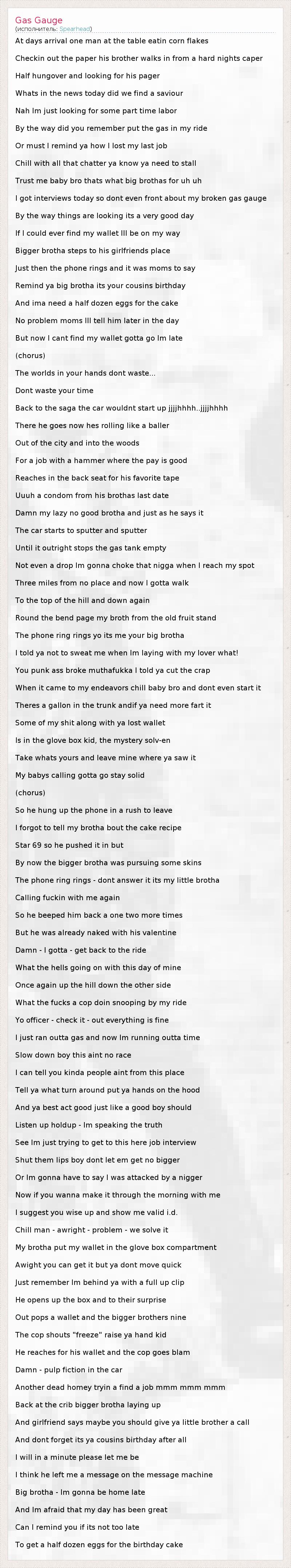 At days arrival one man at the table eatin corn flakes Checkin out the paper his brother walks in from a hard nights caper Half hungover and looking for his pager Whats in the news today did we find a saviour Nah Im just looking for some part time labor By the way did you remember put the gas in my ride Or must I remind ya how I lost my last job Chill with all that chatter ya know ya need to stall Trust me baby bro thats what big brothas for uh uh I got interviews today so dont even front about my broken gas gauge By the way things are looking its a very good day If I could ever find my wallet Ill be on my way Bigger brotha steps to his girlfriends place Just then the phone rings and it was moms to say Remind ya big brotha its your cousins birthday And ima need a half dozen eggs for the cake No problem moms Ill tell him later in the day But now I cant find my wallet gotta go Im late (chorus) The worlds in your hands dont waste... Dont waste your time Back to the saga the car wouldnt start up jjjjhhhh..jjjjhhhh There he goes now hes rolling like a baller Out of the city and into the woods For a job with a hammer where the pay is good Reaches in the back seat for his favorite tape Uuuh a condom from his brothas last date Damn my lazy no good brotha and just as he says it The car starts to sputter and sputter Until it outright stops the gas tank empty Not even a drop Im gonna choke that nigga when I reach my spot Three miles from no place and now I gotta walk To the top of the hill and down again Round the bend page my broth from the old fruit stand The phone ring rings yo its me your big brotha I told ya not to sweat me when Im laying with my lover what! You punk ass broke muthafukka I told ya cut the crap When it came to my endeavors chill baby bro and dont even start it Theres a gallon in the trunk andif ya need more fart it Some of my shit along with ya lost wallet Is in the glove box kid, the mystery solv-en Take whats yours and leave mine where ya saw it My babys calling gotta go stay solid (chorus) So he hung up the phone in a rush to leave I forgot to tell my brotha bout the cake recipe Star 69 so he pushed it in but By now the bigger brotha was pursuing some skins The phone ring rings - dont answer it its my little brotha Calling fuckin with me again So he beeped him back a one two more times But he was already naked with his valentine Damn - I gotta - get back to the ride What the hells going on with this day of mine Once again up the hill down the other side What the fucks a cop doin snooping by my ride Yo officer - check it - out everything is fine I just ran outta gas and now Im running outta time Slow down boy this aint no race I can tell you kinda people aint from this place Tell ya what turn around put ya hands on the hood And ya best act good just like a good boy should Listen up holdup - Im speaking the truth See Im just trying to get to this here job interview Shut them lips boy dont let em get no bigger Or Im gonna have to say I was attacked by a nigger Now if you wanna make it through the morning with me I suggest you wise up and show me valid i.d. Chill man - awright - problem - we solve it My brotha put my wallet in the glove box compartment Awight you can get it but ya dont move quick Just remember Im behind ya with a full up clip He opens up the box and to their surprise Out pops a wallet and the bigger brothers nine The cop shouts "freeze" raise ya hand kid He reaches for his wallet and the cop goes blam Damn - pulp fiction in the car Another dead homey tryin a find a job mmm mmm mmm Back at the crib bigger brotha laying up And girlfriend says maybe you should give ya little brother a call And dont forget its ya cousins birthday after all I will in a minute please let me be I think he left me a message on the message machine Big brotha - Im gonna be home late And Im afraid that my day has been great Can I remind you if its not too late To get a half dozen eggs for the birthday cake