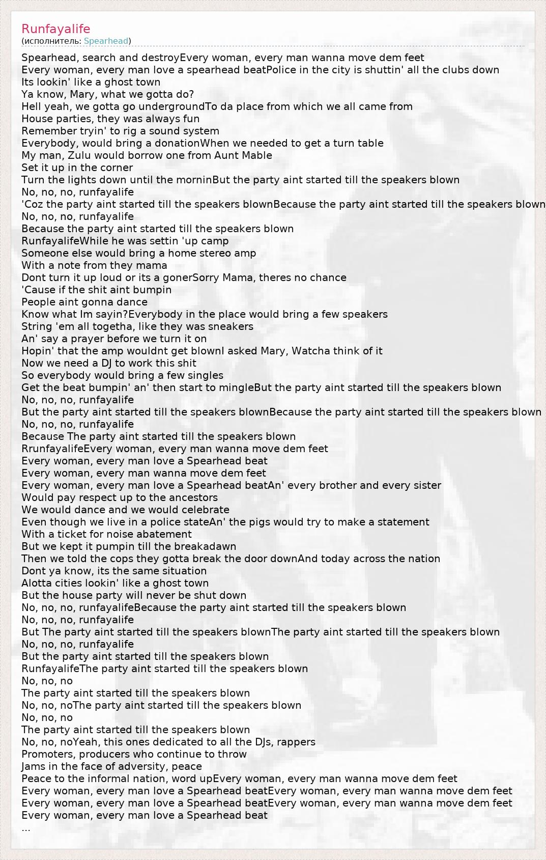 Spearhead, search and destroyEvery woman, every man wanna move dem feet Every woman, every man love a spearhead beatPolice in the city is shuttin' all the clubs down Its lookin' like a ghost town Ya know, Mary, what we gotta do? Hell yeah, we gotta go undergroundTo da place from which we all came from House parties, they was always fun Remember tryin' to rig a sound system Everybody, would bring a donationWhen we needed to get a turn table My man, Zulu would borrow one from Aunt Mable Set it up in the corner Turn the lights down until the morninBut the party aint started till the speakers blown No, no, no, runfayalife 'Coz the party aint started till the speakers blownBecause the party aint started till the speakers blown No, no, no, runfayalife Because the party aint started till the speakers blown RunfayalifeWhile he was settin 'up camp Someone else would bring a home stereo amp With a note from they mama Dont turn it up loud or its a gonerSorry Mama, theres no chance 'Cause if the shit aint bumpin People aint gonna dance Know what Im sayin?Everybody in the place would bring a few speakers String 'em all togetha, like they was sneakers An' say a prayer before we turn it on Hopin' that the amp wouldnt get blownI asked Mary, Watcha think of it Now we need a DJ to work this shit So everybody would bring a few singles Get the beat bumpin' an' then start to mingleBut the party aint started till the speakers blown No, no, no, runfayalife But the party aint started till the speakers blownBecause the party aint started till the speakers blown No, no, no, runfayalife Because The party aint started till the speakers blown RrunfayalifeEvery woman, every man wanna move dem feet Every woman, every man love a Spearhead beat Every woman, every man wanna move dem feet Every woman, every man love a Spearhead beatAn' every brother and every sister Would pay respect up to the ancestors We would dance and we would celebrate Even though we live in a police stateAn' the pigs would try to make a statement With a ticket for noise abatement But we kept it pumpin till the breakadawn Then we told the cops they gotta break the door downAnd today across the nation Dont ya know, its the same situation Alotta cities lookin' like a ghost town But the house party will never be shut down No, no, no, runfayalifeBecause the party aint started till the speakers blown No, no, no, runfayalife But The party aint started till the speakers blownThe party aint started till the speakers blown No, no, no, runfayalife But the party aint started till the speakers blown RunfayalifeThe party aint started till the speakers blown No, no, no The party aint started till the speakers blown No, no, noThe party aint started till the speakers blown No, no, no The party aint started till the speakers blown No, no, noYeah, this ones dedicated to all the DJs, rappers Promoters, producers who continue to throw Jams in the face of adversity, peace Peace to the informal nation, word upEvery woman, every man wanna move dem feet Every woman, every man love a Spearhead beatEvery woman, every man wanna move dem feet Every woman, every man love a Spearhead beatEvery woman, every man wanna move dem feet Every woman, every man love a Spearhead beat ...