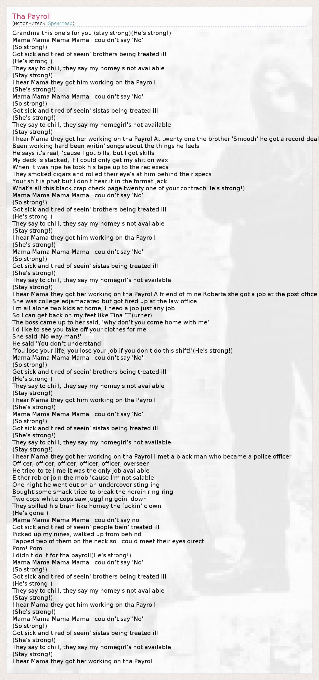 А как ты думаешь, о чем песня "Tha Payroll" ?