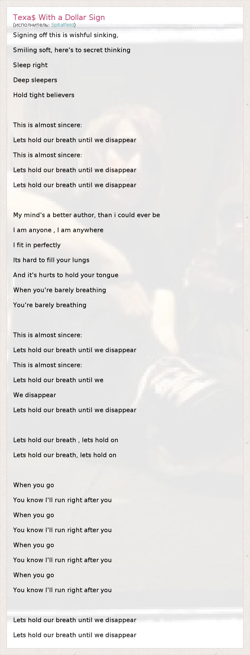 ГлавнаяИсполнителиSpitalfieldTexa$ With a Dollar Sign