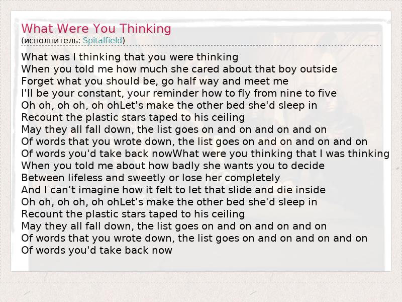 Of words you'd take back nowWhat were you thinking that I was thinking