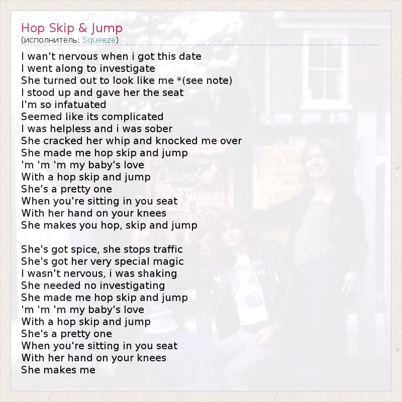 I wan't nervous when i got this date I went along to investigate She turned out to look like me *(see note) I stood up and gave her the seat I'm so infatuated Seemed like its complicated I was helpless and i was sober She cracked her whip and knocked me over She made me hop skip and jump 'm 'm 'm my baby's love With a hop skip and jump She's a pretty one When you're sitting in you seat With her hand on your knees She makes you hop, skip and jump She's got spice, she stops traffic She's got her very special magic I wasn't nervous, i was shaking She needed no investigating She made me hop skip and jump 'm 'm 'm my baby's love With a hop skip and jump She's a pretty one When you're sitting in you seat With her hand on your knees She makes me