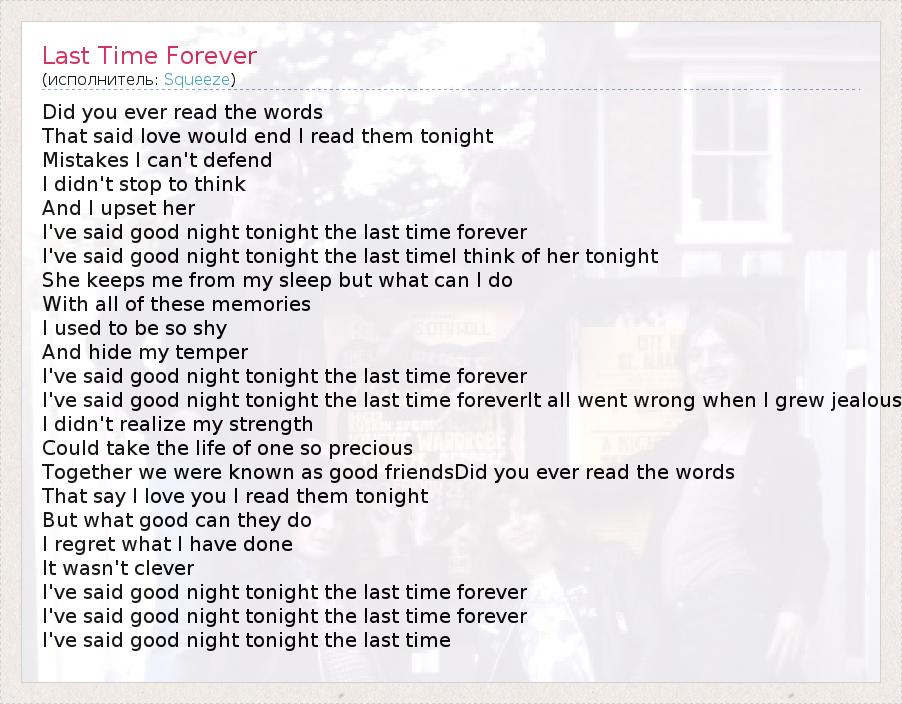 Did you ever read the words That said love would end I read them tonight Mistakes I can't defend I didn't stop to think And I upset her I've said good night tonight the last time forever I've said good night tonight the last timeI think of her tonight She keeps me from my sleep but what can I do With all of these memories I used to be so shy And hide my temper I've said good night tonight the last time forever I've said good night tonight the last time foreverIt all went wrong when I grew jealous I didn't realize my strength Could take the life of one so precious Together we were known as good friendsDid you ever read the words That say I love you I read them tonight But what good can they do I regret what I have done It wasn't clever I've said good night tonight the last time forever I've said good night tonight the last time forever I've said good night tonight the last time