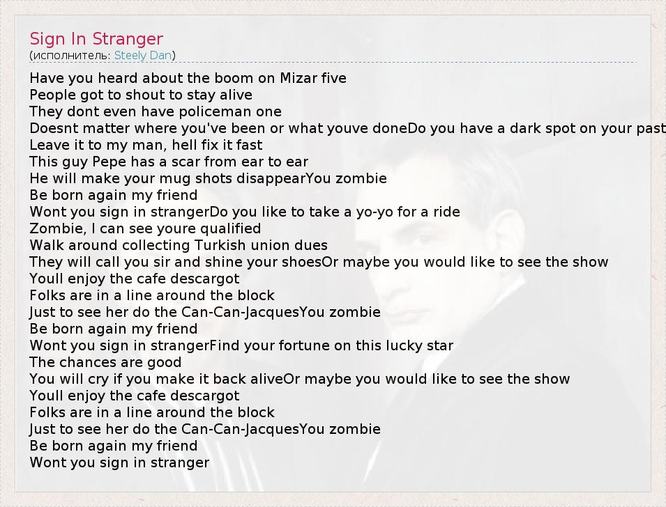 А как ты думаешь, о чем песня "Sign In Stranger" ?