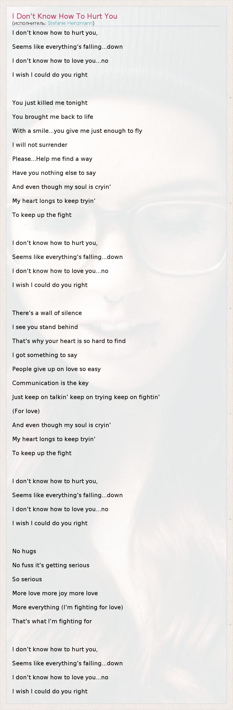 I don't know how to hurt you, Seems like everything's falling...down I don't know how to love you...no I wish I could do you right You just killed me tonight You brought me back to life With a smile...you give me just enough to fly I will not surrender Please...Help me find a way Have you nothing else to say And even though my soul is cryin' My heart longs to keep tryin' To keep up the fight I don't know how to hurt you, Seems like everything's falling...down I don't know how to love you...no I wish I could do you right There's a wall of silence I see you stand behind That's why your heart is so hard to find I got something to say People give up on love so easy Communication is the key Just keep on talkin' keep on trying keep on fightin' (For love) And even though my soul is cryin' My heart longs to keep tryin' To keep up the fight I don't know how to hurt you, Seems like everything's falling...down I don't know how to love you...no I wish I could do you right No hugs No fuss it's getting serious So serious More love more joy more love More everything (I'm fighting for love) That's what I'm fighting for I don't know how to hurt you, Seems like everything's falling...down I don't know how to love you...no I wish I could do you right