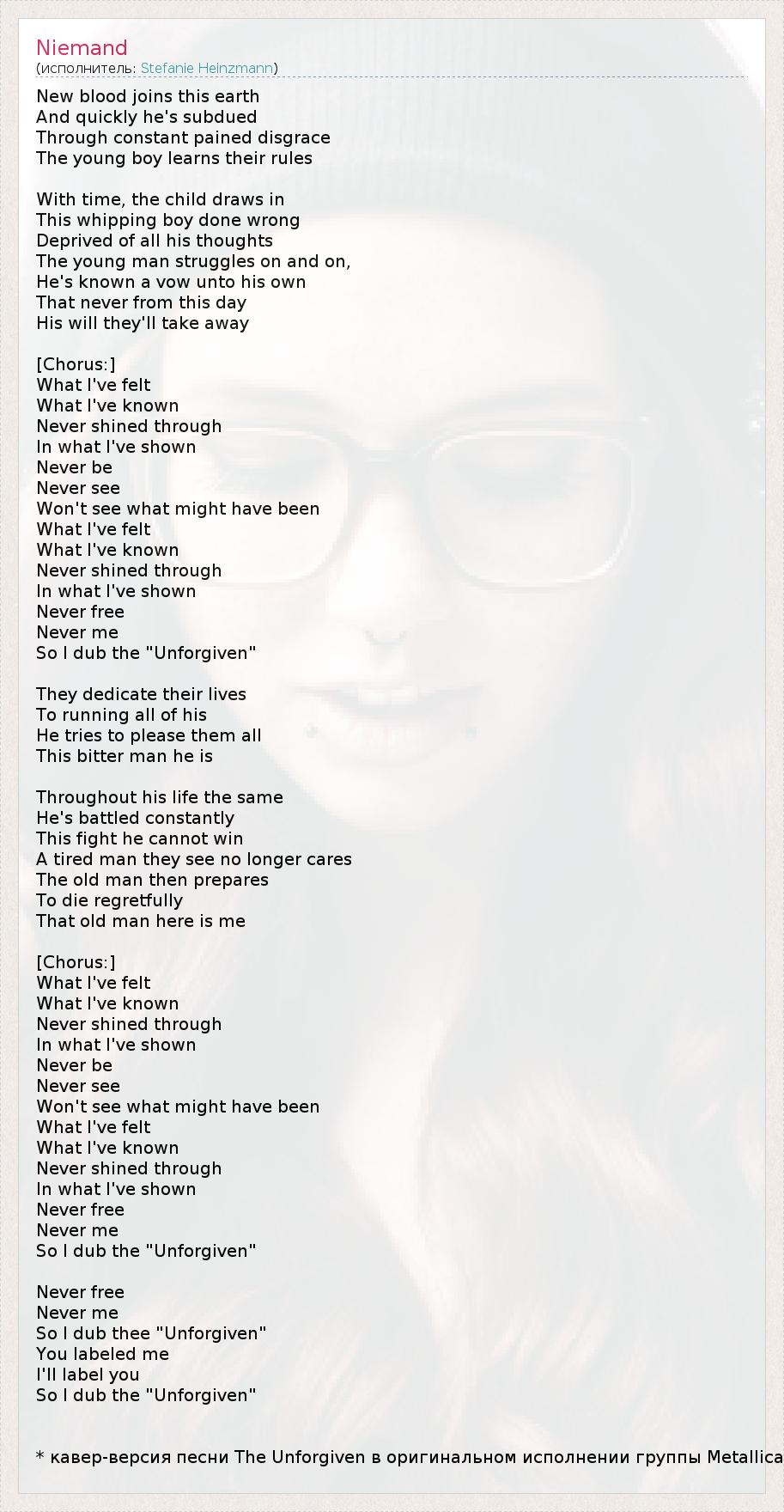 New blood joins this earth And quickly he's subdued Through constant pained disgrace The young boy learns their rules With time, the child draws in This whipping boy done wrong Deprived of all his thoughts The young man struggles on and on, He's known a vow unto his own That never from this day His will they'll take away [Chorus:] What I've felt What I've known Never shined through In what I've shown Never be Never see Won't see what might have been What I've felt What I've known Never shined through In what I've shown Never free Never me So I dub the "Unforgiven" They dedicate their lives To running all of his He tries to please them all This bitter man he is Throughout his life the same He's battled constantly This fight he cannot win A tired man they see no longer cares The old man then prepares To die regretfully That old man here is me [Chorus:] What I've felt What I've known Never shined through In what I've shown Never be Never see Won't see what might have been What I've felt What I've known Never shined through In what I've shown Never free Never me So I dub the "Unforgiven" Never free Never me So I dub thee "Unforgiven" You labeled me I'll label you So I dub the "Unforgiven" * кавер-версия песни The Unforgiven в оригинальном исполнении группы Metallica