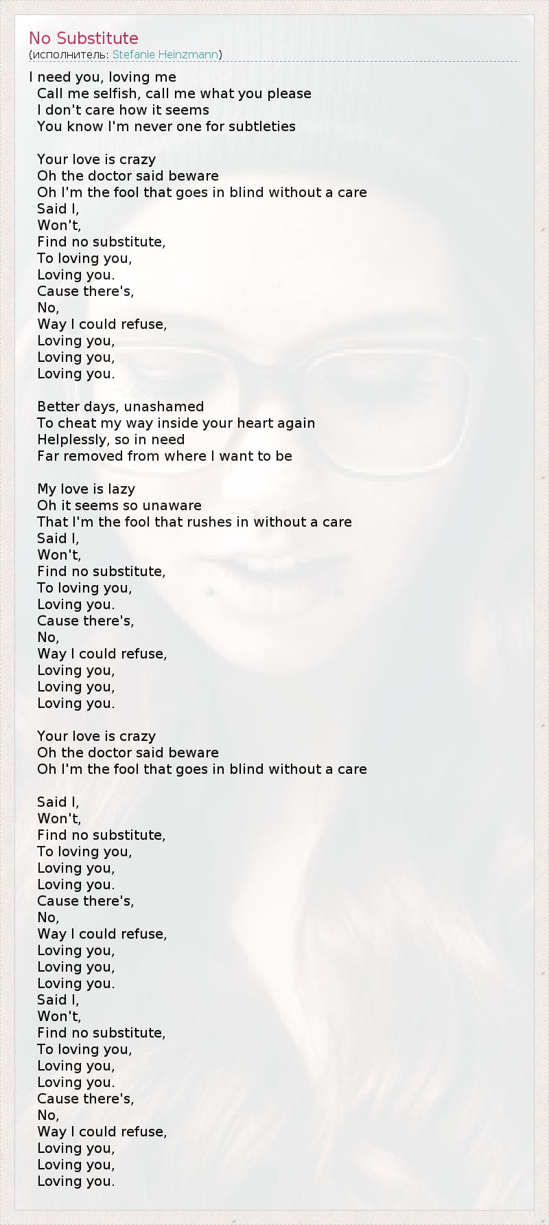 I need you, loving me Call me selfish, call me what you please I don't care how it seems You know I'm never one for subtleties Your love is crazy Oh the doctor said beware Oh I'm the fool that goes in blind without a care Said I, Won't, Find no substitute, To loving you, Loving you. Cause there's, No, Way I could refuse, Loving you, Loving you, Loving you. Better days, unashamed To cheat my way inside your heart again Helplessly, so in need Far removed from where I want to be My love is lazy Oh it seems so unaware That I'm the fool that rushes in without a care Said I, Won't, Find no substitute, To loving you, Loving you. Cause there's, No, Way I could refuse, Loving you, Loving you, Loving you. Your love is crazy Oh the doctor said beware Oh I'm the fool that goes in blind without a care Said I, Won't, Find no substitute, To loving you, Loving you, Loving you. Cause there's, No, Way I could refuse, Loving you, Loving you, Loving you. Said I, Won't, Find no substitute, To loving you, Loving you, Loving you. Cause there's, No, Way I could refuse, Loving you, Loving you, Loving you.