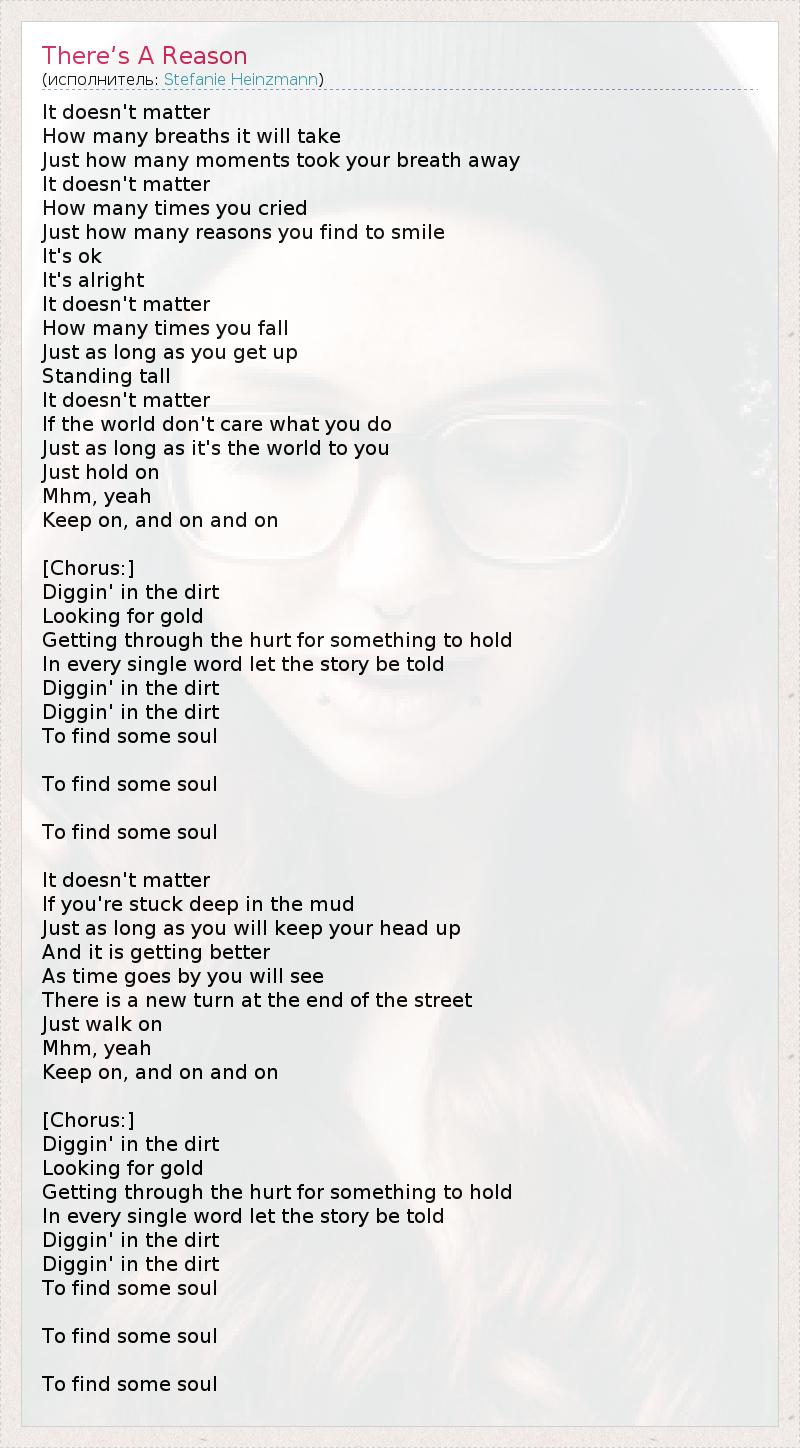 Неважно, Сколько потребуется вдохов. Важно лишь, от скольких моментов у тебя захватит дух. Неважно, Сколько раз ты плакал. Важно лишь, сколько причин ты нашел, чтобы улыбнуться. Это нормально, Все в порядке. Неважно, Сколько раз ты упадешь. Важно лишь то, пока ты поднимаешься на ноги, Преодолевая невзгоды. Неважно, Если миру все равно, что ты делаешь. Важно лишь то, пока это мир для тебя. Просто держись. Мм, да. Продолжай дальше и дальше [Припев:] Копаться в грязи В поисках золота, Проходить через боль ради чего-то, что нужно сохранить. Пусть каждое слово слагает историю. Копайся в грязи, Копайся в грязи, Чтобы отыскать душу, Чтобы отыскать душу, Чтобы отыскать душу. Неважно, Если ты глубоко завяз в грязи. Важно лишь то, пока ты не вешаешь голову. И все наладится, Пройдет время, и ты увидишь Новый поворот в конце дороги. Просто продолжай идти. Мм, да. Продолжай дальше и дальше [Припев:] Копаться в грязи В поисках золота, Проходить через боль ради чего-то, что нужно сохранить. Пусть каждое слово слагает историю. Копайся в грязи, Копайся в грязи, Чтобы отыскать душу, Чтобы отыскать душу, Чтобы отыскать душу.