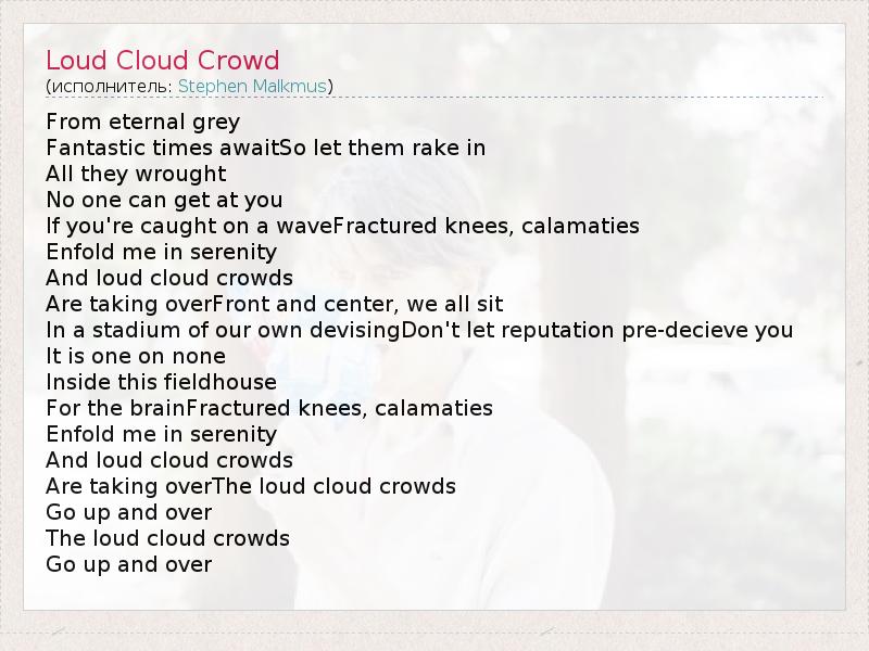 From eternal grey Fantastic times awaitSo let them rake in All they wrought No one can get at you If you're caught on a waveFractured knees, calamaties Enfold me in serenity And loud cloud crowds Are taking overFront and center, we all sit In a stadium of our own devisingDon't let reputation pre-decieve you It is one on none Inside this fieldhouse For the brainFractured knees, calamaties Enfold me in serenity And loud cloud crowds Are taking overThe loud cloud crowds Go up and over The loud cloud crowds Go up and over