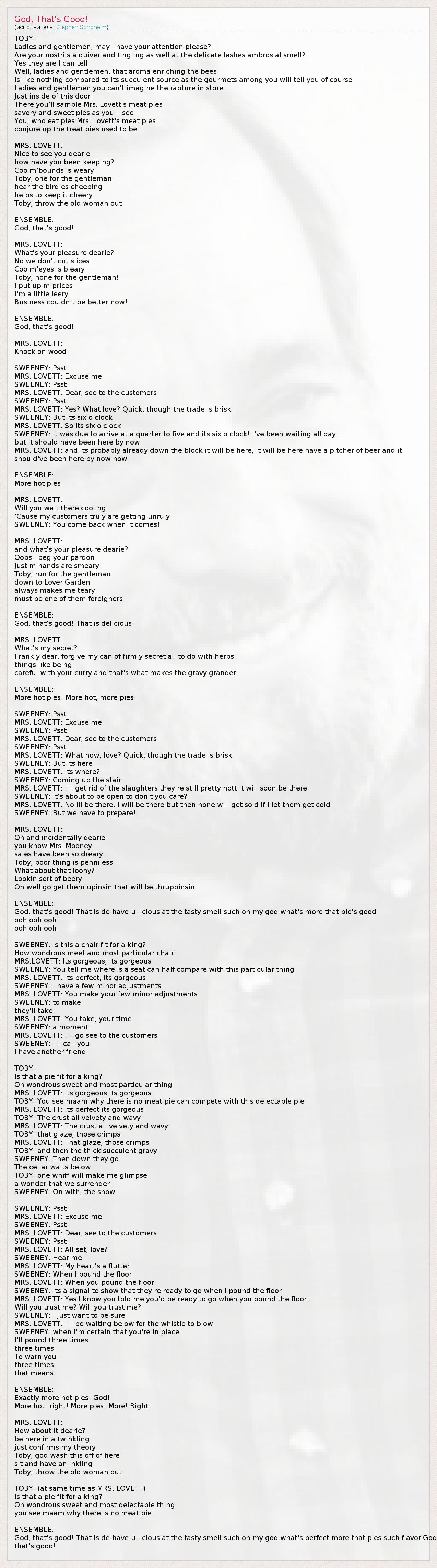 TOBY: Ladies and gentlemen, may I have your attention please? Are your nostrils a quiver and tingling as well at the delicate lashes ambrosial smell? Yes they are I can tell Well, ladies and gentlemen, that aroma enriching the bees Is like nothing compared to its succulent source as the gourmets among you will tell you of course Ladies and gentlemen you can't imagine the rapture in store Just inside of this door! There you'll sample Mrs. Lovett's meat pies savory and sweet pies as you'll see You, who eat pies Mrs. Lovett's meat pies conjure up the treat pies used to be MRS. LOVETT: Nice to see you dearie how have you been keeping? Coo m'bounds is weary Toby, one for the gentleman hear the birdies cheeping helps to keep it cheery Toby, throw the old woman out! ENSEMBLE: God, that's good! MRS. LOVETT: What's your pleasure dearie? No we don't cut slices Coo m'eyes is bleary Toby, none for the gentleman! I put up m'prices I'm a little leery Business couldn't be better now! ENSEMBLE: God, that's good! MRS. LOVETT: Knock on wood! SWEENEY: Psst! MRS. LOVETT: Excuse me SWEENEY: Psst! MRS. LOVETT: Dear, see to the customers SWEENEY: Psst! MRS. LOVETT: Yes? What love? Quick, though the trade is brisk SWEENEY: But its six o clock MRS. LOVETT: So its six o clock SWEENEY: It was due to arrive at a quarter to five and its six o clock! I've been waiting all day but it should have been here by now MRS. LOVETT: and its probably already down the block it will be here, it will be here have a pitcher of beer and it should've been here by now now ENSEMBLE: More hot pies! MRS. LOVETT: Will you wait there cooling 'Cause my customers truly are getting unruly SWEENEY: You come back when it comes! MRS. LOVETT: and what's your pleasure dearie? Oops I beg your pardon Just m'hands are smeary Toby, run for the gentleman down to Lover Garden always makes me teary must be one of them foreigners ENSEMBLE: God, that's good! That is delicious! MRS. LOVETT: What's my secret? Frankly dear, forgive my can of firmly secret all to do with herbs things like being careful with your curry and that's what makes the gravy grander ENSEMBLE: More hot pies! More hot, more pies! SWEENEY: Psst! MRS. LOVETT: Excuse me SWEENEY: Psst! MRS. LOVETT: Dear, see to the customers SWEENEY: Psst! MRS. LOVETT: What now, love? Quick, though the trade is brisk SWEENEY: But its here MRS. LOVETT: Its where? SWEENEY: Coming up the stair MRS. LOVETT: I'll get rid of the slaughters they're still pretty hott it will soon be there SWEENEY: It's about to be open to don't you care? MRS. LOVETT: No Ill be there, I will be there but then none will get sold if I let them get cold SWEENEY: But we have to prepare! MRS. LOVETT: Oh and incidentally dearie you know Mrs. Mooney sales have been so dreary Toby, poor thing is penniless What about that loony? Lookin sort of beery Oh well go get them upinsin that will be thruppinsin ENSEMBLE: God, that's good! That is de-have-u-licious at the tasty smell such oh my god what's more that pie's good ooh ooh ooh ooh ooh ooh SWEENEY: Is this a chair fit for a king? How wondrous meet and most particular chair MRS.LOVETT: Its gorgeous, its gorgeous SWEENEY: You tell me where is a seat can half compare with this particular thing MRS. LOVETT: Its perfect, its gorgeous SWEENEY: I have a few minor adjustments MRS. LOVETT: You make your few minor adjustments SWEENEY: to make they'll take MRS. LOVETT: You take, your time SWEENEY: a moment MRS. LOVETT: I'll go see to the customers SWEENEY: I'll call you I have another friend TOBY: Is that a pie fit for a king? Oh wondrous sweet and most particular thing MRS. LOVETT: Its gorgeous its gorgeous TOBY: You see maam why there is no meat pie can compete with this delectable pie MRS. LOVETT: Its perfect its gorgeous TOBY: The crust all velvety and wavy MRS. LOVETT: The crust all velvety and wavy TOBY: that glaze, those crimps MRS. LOVETT: That glaze, those crimps TOBY: and then the thick succulent gravy SWEENEY: Then down they go The cellar waits below TOBY: one whiff will make me glimpse a wonder that we surrender SWEENEY: On with, the show SWEENEY: Psst! MRS. LOVETT: Excuse me SWEENEY: Psst! MRS. LOVETT: Dear, see to the customers SWEENEY: Psst! MRS. LOVETT: All set, love? SWEENEY: Hear me MRS. LOVETT: My heart's a flutter SWEENEY: When I pound the floor MRS. LOVETT: When you pound the floor SWEENEY: Its a signal to show that they're ready to go when I pound the floor MRS. LOVETT: Yes I know you told me you'd be ready to go when you pound the floor! Will you trust me? Will you trust me? SWEENEY: I just want to be sure MRS. LOVETT: I'll be waiting below for the whistle to blow SWEENEY: when I'm certain that you're in place I'll pound three times three times To warn you three times that means ENSEMBLE: Exactly more hot pies! God! More hot! right! More pies! More! Right! MRS. LOVETT: How about it dearie? be here in a twinkling just confirms my theory Toby, god wash this off of here sit and have an inkling Toby, throw the old woman out TOBY: (at same time as MRS. LOVETT) Is that a pie fit for a king? Oh wondrous sweet and most delectable thing you see maam why there is no meat pie ENSEMBLE: God, that's good! That is de-have-u-licious at the tasty smell such oh my god what's perfect more that pies such flavor God that's good!