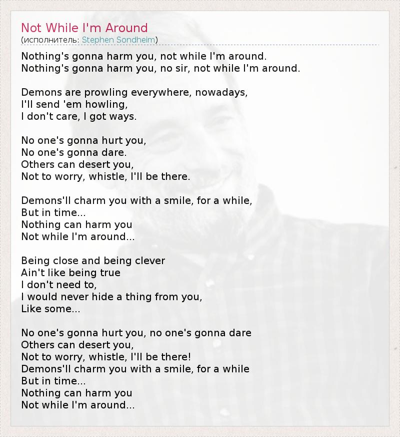 Nothing's gonna harm you, not while I'm around. Nothing's gonna harm you, no sir, not while I'm around. Demons are prowling everywhere, nowadays, I'll send 'em howling, I don't care, I got ways. No one's gonna hurt you, No one's gonna dare. Others can desert you, Not to worry, whistle, I'll be there. Demons'll charm you with a smile, for a while, But in time... Nothing can harm you Not while I'm around... Being close and being clever Ain't like being true I don't need to, I would never hide a thing from you, Like some... No one's gonna hurt you, no one's gonna dare Others can desert you, Not to worry, whistle, I'll be there! Demons'll charm you with a smile, for a while But in time... Nothing can harm you Not while I'm around...
