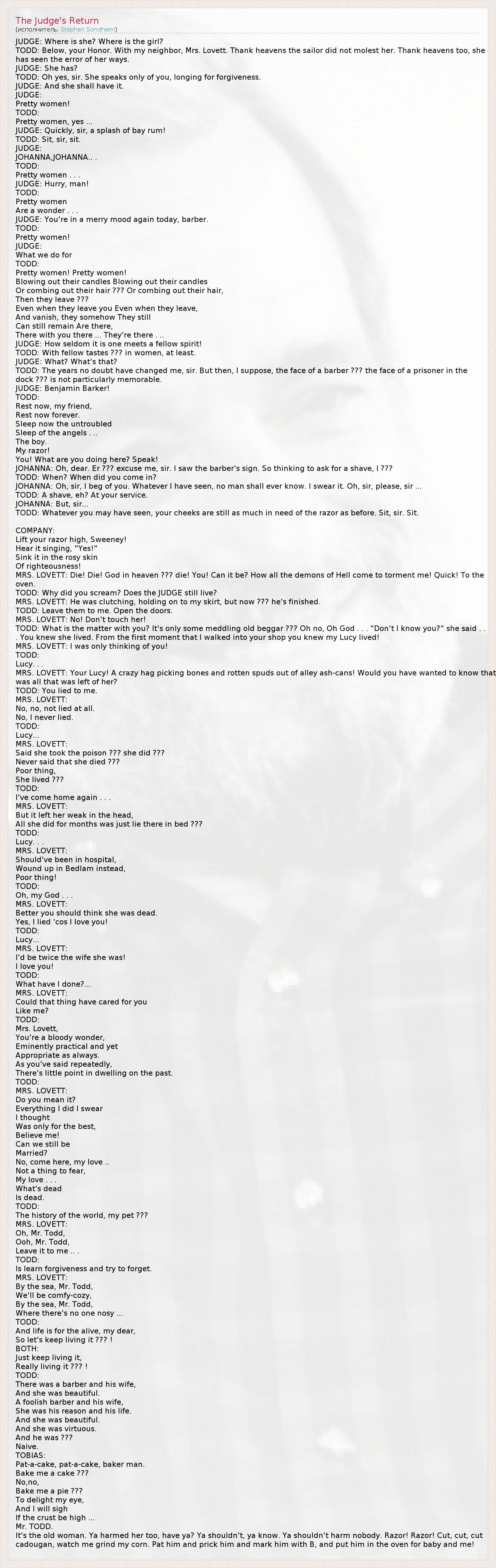 JUDGE: Where is she? Where is the girl? TODD: Below, your Honor. With my neighbor, Mrs. Lovett. Thank heavens the sailor did not molest her. Thank heavens too, she has seen the error of her ways. JUDGE: She has? TODD: Oh yes, sir. She speaks only of you, longing for forgiveness. JUDGE: And she shall have it. JUDGE: Pretty women! TODD: Pretty women, yes ... JUDGE: Quickly, sir, a splash of bay rum! TODD: Sit, sir, sit. JUDGE: JOHANNA,JOHANNA.. . TODD: Pretty women . . . JUDGE: Hurry, man! TODD: Pretty women Are a wonder . . . JUDGE: You're in a merry mood again today, barber. TODD: Pretty women! JUDGE: What we do for TODD: Pretty women! Pretty women! Blowing out their candles Blowing out their candles Or combing out their hair ??? Or combing out their hair, Then they leave ??? Even when they leave you Even when they leave, And vanish, they somehow They still Can still remain Are there, There with you there ... They're there . .. JUDGE: How seldom it is one meets a fellow spirit! TODD: With fellow tastes ??? in women, at least. JUDGE: What? What's that? TODD: The years no doubt have changed me, sir. But then, I suppose, the face of a barber ??? the face of a prisoner in the dock ??? is not particularly memorable. JUDGE: Benjamin Barker! TODD: Rest now, my friend, Rest now forever. Sleep now the untroubled Sleep of the angels . .. The boy. My razor! You! What are you doing here? Speak! JOHANNA: Oh, dear. Er ??? excuse me, sir. I saw the barber's sign. So thinking to ask for a shave, I ??? TODD: When? When did you come in? JOHANNA: Oh, sir, I beg of you. Whatever I have seen, no man shall ever know. I swear it. Oh, sir, please, sir ... TODD: A shave, eh? At your service. JOHANNA: But, sir... TODD: Whatever you may have seen, your cheeks are still as much in need of the razor as before. Sit, sir. Sit. COMPANY: Lift your razor high, Sweeney! Hear it singing, "Yes!" Sink it in the rosy skin Of righteousness! MRS. LOVETT: Die! Die! God in heaven ??? die! You! Can it be? How all the demons of Hell come to torment me! Quick! To the oven. TODD: Why did you scream? Does the JUDGE still live? MRS. LOVETT: He was clutching, holding on to my skirt, but now ??? he's finished. TODD: Leave them to me. Open the doors. MRS. LOVETT: No! Don't touch her! TODD: What is the matter with you? It's only some meddling old beggar ??? Oh no, Oh God . . . "Don't I know you?" she said . . . You knew she lived. From the first moment that I walked into your shop you knew my Lucy lived! MRS. LOVETT: I was only thinking of you! TODD: Lucy. . . MRS. LOVETT: Your Lucy! A crazy hag picking bones and rotten spuds out of alley ash-cans! Would you have wanted to know that was all that was left of her? TODD: You lied to me. MRS. LOVETT: No, no, not lied at all. No, I never lied. TODD: Lucy... MRS. LOVETT: Said she took the poison ??? she did ??? Never said that she died ??? Poor thing, She lived ??? TODD: I've come home again . . . MRS. LOVETT: But it left her weak in the head, All she did for months was just lie there in bed ??? TODD: Lucy. . . MRS. LOVETT: Should've been in hospital, Wound up in Bedlam instead, Poor thing! TODD: Oh, my God . . . MRS. LOVETT: Better you should think she was dead. Yes, I lied 'cos I love you! TODD: Lucy... MRS. LOVETT: I'd be twice the wife she was! I love you! TODD: What have I done?... MRS. LOVETT: Could that thing have cared for you Like me? TODD: Mrs. Lovett, You're a bloody wonder, Eminently practical and yet Appropriate as always. As you've said repeatedly, There's little point in dwelling on the past. TODD: MRS. LOVETT: Do you mean it? Everything I did I swear I thought Was only for the best, Believe me! Can we still be Married? No, come here, my love .. Not a thing to fear, My love . . . What's dead Is dead. TODD: The history of the world, my pet ??? MRS. LOVETT: Oh, Mr. Todd, Ooh, Mr. Todd, Leave it to me .. . TODD: Is learn forgiveness and try to forget. MRS. LOVETT: By the sea, Mr. Todd, We'll be comfy-cozy, By the sea, Mr. Todd, Where there's no one nosy ... TODD: And life is for the alive, my dear, So let's keep living it ??? ! BOTH: Just keep living it, Really living it ??? ! TODD: There was a barber and his wife, And she was beautiful. A foolish barber and his wife, She was his reason and his life. And she was beautiful. And she was virtuous. And he was ??? Naive. TOBIAS: Pat-a-cake, pat-a-cake, baker man. Bake me a cake ??? No,no, Bake me a pie ??? To delight my eye, And I will sigh If the crust be high ... Mr. TODD. It's the old woman. Ya harmed her too, have ya? Ya shouldn't, ya know. Ya shouldn't harm nobody. Razor! Razor! Cut, cut, cut cadougan, watch me grind my corn. Pat him and prick him and mark him with B, and put him in the oven for baby and me!