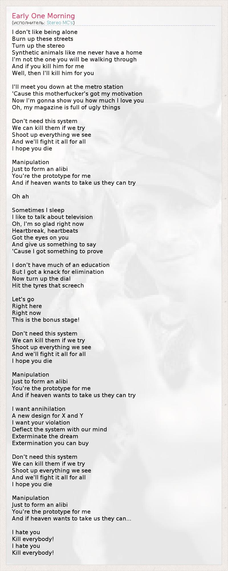 Я не люблю одиночество, Давай мчаться по улицам, Включив музыку... Такие синтетические животные, как я - всегда бездомные. Я не тот, кто позволит тебе завалить дело. И если ты убьешь его для меня, Тогда я убью его для тебя. Встретимся внизу, на станции метро, Потому что эти ублюдки просекли, зачем я это делаю. Сейчас я покажу тебе, насколько сильно я тебя люблю, О, магазин моего ружья* полон жутко опасных штучек. Нам не нужна их система, Мы сможем убить их, если решимся. Стреляй во все, что видишь, Мы будем сражаться, несмотря ни на что, Надеюсь, ты умрешь. Манипуляция – Просто для того, чтобы обеспечить себе алиби. Ты – мой прототип, И если небо хочет забрать нас, что ж, пусть попытается. О, а... Иногда я сплю, Люблю поговорить о телевидении. О, как я рад сейчас. Разбитые сердца, сердцебиение... Мой взгляд остановился на тебе. Дайте нам возможность высказаться, Потому что мне есть, что доказывать. Да, у меня нет никакого особого образования, Зато я отлично владею умением уничтожать. Прибавь-ка громкость, И пусть шины визжат. Поехали, Прямо здесь, Прямо сейчас, Это наша дополнительная сцена! Нам не нужна их система, Мы сможем убить их, если решимся. Стреляй во все, что видишь, Мы будем сражаться, несмотря ни на что, Надеюсь, ты умрешь. Манипуляция – Просто для того, чтобы обеспечить себе алиби. Ты – мой прототип, И если небо хочет забрать нас, что ж, пусть попытается. Я хочу полного уничтожения, Хочу новый дизайн для X и Y. Я жду от тебя проявления жесткости, Давай изменим систему силой нашего разума. Истребляй мечту, Истребление можно купить. Нам не нужна их система, Мы сможем убить их, если решимся. Стреляй во все, что видишь, Мы будем сражаться, несмотря ни на что, Надеюсь, ты умрешь. Манипуляция – Просто для того, чтобы обеспечить себе алиби. Ты – мой прототип, И если небо хочет забрать нас, что ж, пусть попытается. Я ненавижу вас! Убьем их всех! Я ненавижу вас! Убьем их всех! * - magazine - это не только "журнал", но и "магазин стрелкового оружия", "склад боеприпасов"