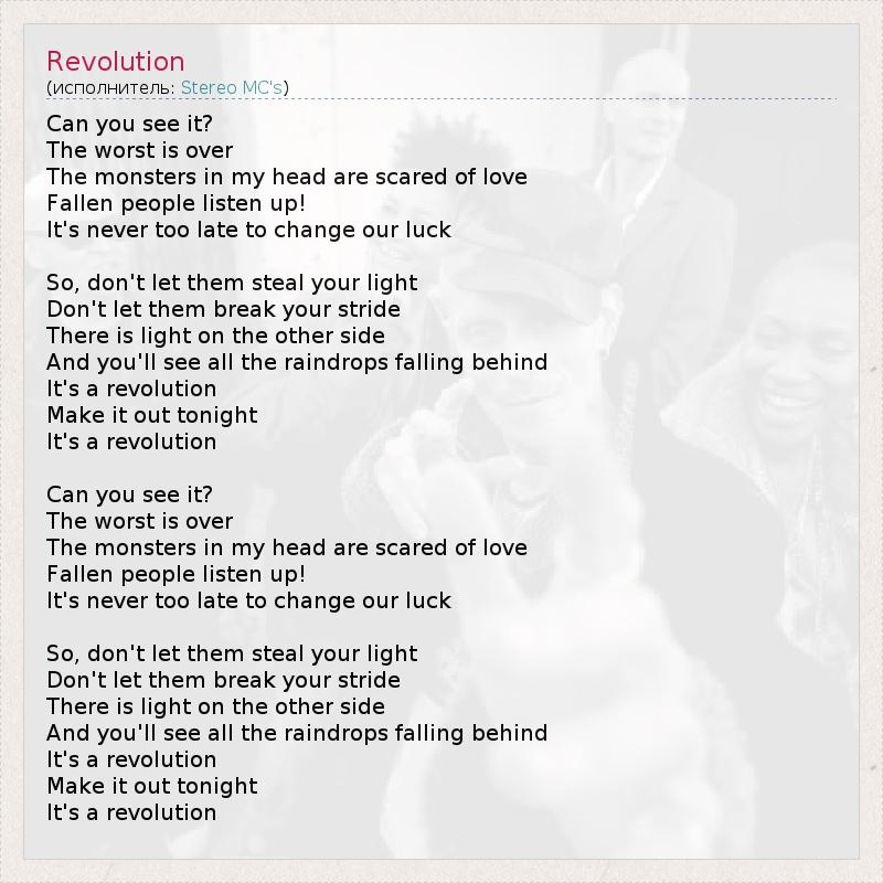 Вы видите? Худшее уже позади. Монстры в моей голове боятся любви. Слушайте, падшие люди! Никогда не поздно изменить нашу судьбу. Поэтому не дайте поглотить ваш свет. Не дайте помешать вам идти вперед. На той стороне есть свет, И вы увидите все капли дождя, падающие у вас за спиной. Это революция. Поймите это сегодня ночью. Это революция. Вы видите? Худшее уже позади. Монстры в моей голове боятся любви. Слушайте, падшие люди! Никогда не поздно изменить нашу судьбу. Поэтому не дайте поглотить ваш свет. Не дайте помешать вам идти вперед. На той стороне есть свет, И вы увидите все капли дождя, падающие у вас за спиной. Это революция. Поймите это сегодня ночью. Это революция.