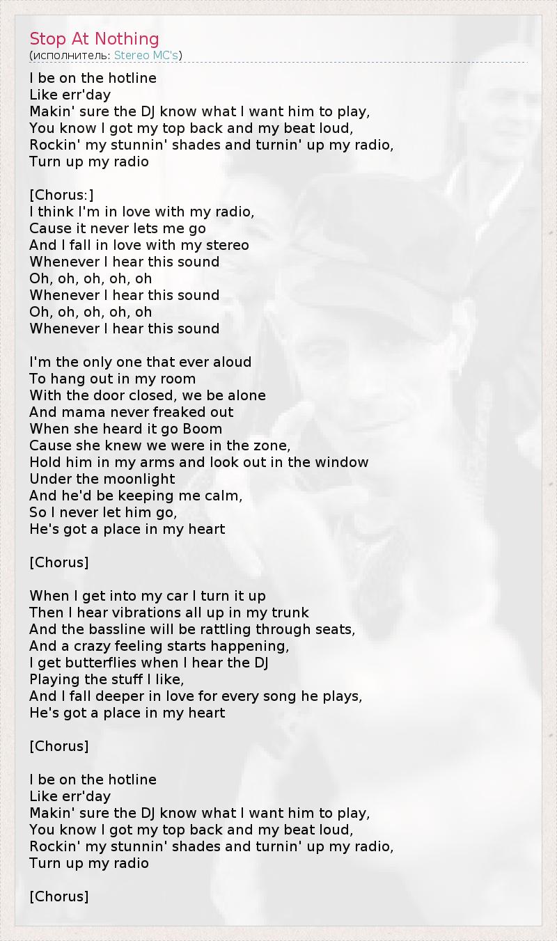 I be on the hotline Like err'day Makin' sure the DJ know what I want him to play, You know I got my top back and my beat loud, Rockin' my stunnin' shades and turnin' up my radio, Turn up my radio [Chorus:] I think I'm in love with my radio, Cause it never lets me go And I fall in love with my stereo Whenever I hear this sound Oh, oh, oh, oh, oh Whenever I hear this sound Oh, oh, oh, oh, oh Whenever I hear this sound I'm the only one that ever aloud To hang out in my room With the door closed, we be alone And mama never freaked out When she heard it go Boom Cause she knew we were in the zone, Hold him in my arms and look out in the window Under the moonlight And he'd be keeping me calm, So I never let him go, He's got a place in my heart [Chorus] When I get into my car I turn it up Then I hear vibrations all up in my trunk And the bassline will be rattling through seats, And a crazy feeling starts happening, I get butterflies when I hear the DJ Playing the stuff I like, And I fall deeper in love for every song he plays, He's got a place in my heart [Chorus] I be on the hotline Like err'day Makin' sure the DJ know what I want him to play, You know I got my top back and my beat loud, Rockin' my stunnin' shades and turnin' up my radio, Turn up my radio [Chorus]